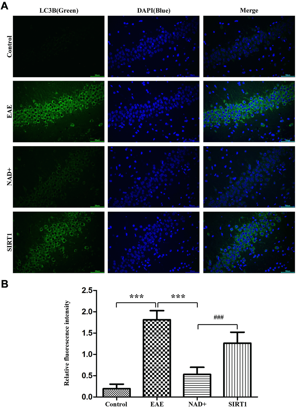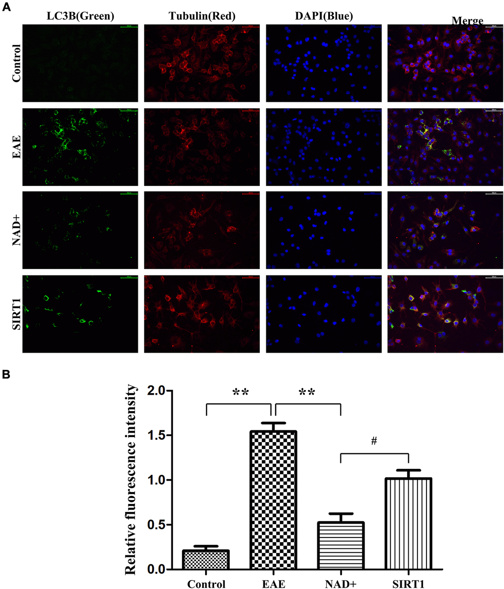 Under fluorescence microscope, immunofluorescence staining showed that the fluorescence intensity of LC-3A/B in EAE group was the highest, followed by SIRT1 inhibitor group, NAD+ group, and control group (Figure 6).