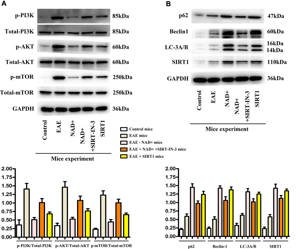 In our mice experiments, the expressions of p-PI3K, p-AKT, p-mTOR, P62, Beclin1, LC-3A/B and SIRT1 were observed in the chemiluminescence gel imaging system. It was found that the expressions of P62, Beclin1, LC-3A/B and SIRT1 were the highest in the NAD+ group, followed by the NAD+ + SIRT-IN-3 group, the EAE group and the control group, while the expressions of p-PI3K, p-Akt and p-mTOR were the highest in the EAE group. The following were NAD+ + SIRT-IN-3 group, NAD+ group, control group and the SIRT1 showed the similar tendency as NAD+ group (Figure 5). Autophagy effectively removed damaged organelles and suppressed the incidence of apoptosis, preserving the integrity of brain in the disease of EAE. The activation or phosphorylated-PI3K/AKT/mTOR signals are key and primary regulatory proteins for inhibition of autophagy, thereby, the inhibition of the PI3K could opportunely and competitively induced the incidence of autophagy. NAD+ effectively decreased phosphorylated PI3K, AKT, mTOR, vs EAE group, and SIRT-IN-3 relieved NAD+’ roles. SIRT1 is the key suppressor for PI3K signals, and combined with these results, NAD+ alleviated PI3K and increased autophagy may by increasing SIRT1 expression in EAE diseases.