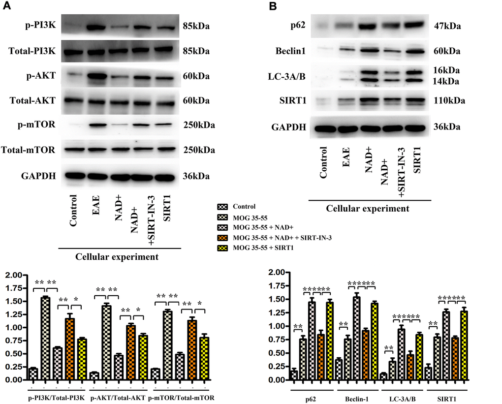 The expressions of p-PI3K, p-AKT, p-mTOR, P62, Beclin1, LC-3A/B and SIRT1 were observed in the chemiluminescence gel imaging system. It was found that the expressions of P62, Beclin1, LC-3A/B and SIRT1 were the highest in the NAD+ group, followed by the SIRT1 inhibitor group, the EAE group and the control group, while the expressions of p-PI3K, p-Akt and p-mTOR were the highest in the EAE group. The following were SIRT1 inhibitor group, NAD+ group, and control group (Figure 7).