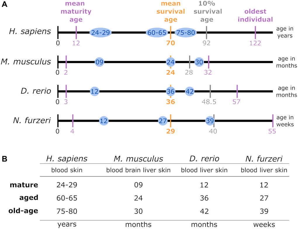 The 4 investigated species differ with respect to their lifespans. To facilitate comparability, we normalized their lifespans to key biological stages: Time of maturity, average survival and extended survival reached by 10% of the individuals as well as the maximum reported age at death (see Figure 1A). According to these time scales, we defined 3 representative time categories comparable for each species – mature, aged, and old-age. Among these, we performed 3 different age comparisons denoted as early aging (mature vs. aged), late aging (mature vs. old-age), and longevity (aged vs. old-age) (see Figure 1B). Information on maturation and survival of the 4 species was underlying different sources: for H. sapiens [22–24]; for M. musculus [25–28]; for D. rerio [29–32]; and for N. furzeri [19, 33–35].