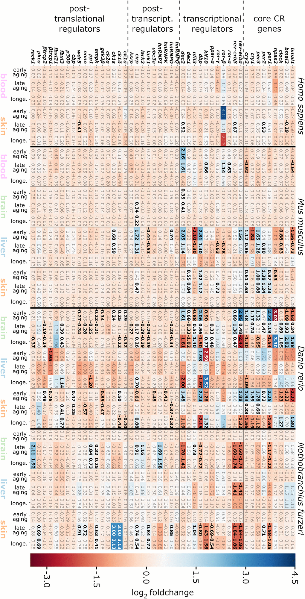 Multiple efforts have aimed at mapping physiological and pathological processes to the circadian system either in individual [12, 102] or multiple organs [11] of a single species or in selected organs underlying a pathophysiological stressor [103]. However, the role of highly conserved CR regulation in physiological aging over time and across multiple species has not yet been addressed. Here, we used RNA-Seq data to profile the regulation of CR-related genes of 4 different species in a cross-sectional study in individuals ranging from young mature to old-age categories. We compared changes of the CR transcriptome in different organs within these species, including brain, blood, liver, and skin. In summary, our results show that modulations in CR-related gene transcription throughout aging are a conserved trait that is traceable across evolutionarily diverse species, ranging from humans to mice and fish. Thereby, we identified 2 CR-related genes, i.e., dec2 and per2, to be altered in all 4 species primarily in early aging and late aging rather than longevity, and 4 genes (cirp, klf10, nfil3, and dbp) with conserved aging-related expression patterns in several organs and species.