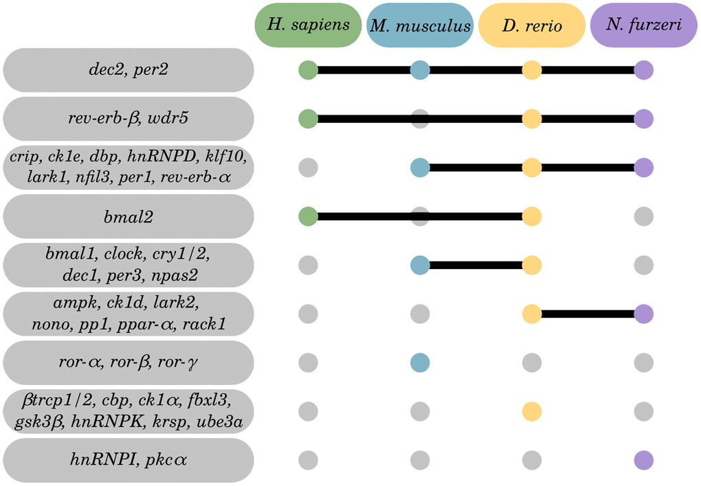 However, it is not well studied in how far changes in the expression of CR core genes and their downstream targets are responsible for age-related variations in CR regulation. Moreover, it is unclear to what extent these changes in CR gene regulatory patterns may overlap in distinct tissues and species. A related open question remains as to whether a conserved age-related pattern of CR gene expression alterations might exist that will be common to and retraceable across different species and tissues. Apart from the pulsed expression of the superordinate core set of clock genes and related transcription factors in the brain hypothalamus [16], the aforementioned SCN-independent, self-sustained functionality of the CR is operating at the single-organ level, as it is well-described, e.g., for skin and liver [17]. Thus, evidence of SCN-independent CR regulation requires species with an evolutionary conserved decentralized CR, such as fish‚ and the inclusion of self-entrained organs.
