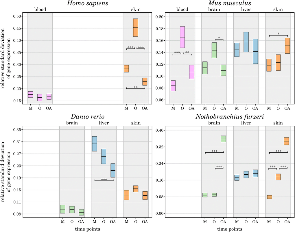 In D. rerio, the inter-group variability in gene expression was constantly decreasing with age selectively in liver samples. Exclusively in N. furzeri, the expression variances reflected a consistent pattern of an increased relative standard deviation towards old-age, pointing to a less robust expression of the CR. This observation supports our finding that DEGs were primarily arising from the old-age category in N. furzeri. Longitudinal studies are required to characterize the robustness of CR-related gene expression patterns within the different tissues and species.