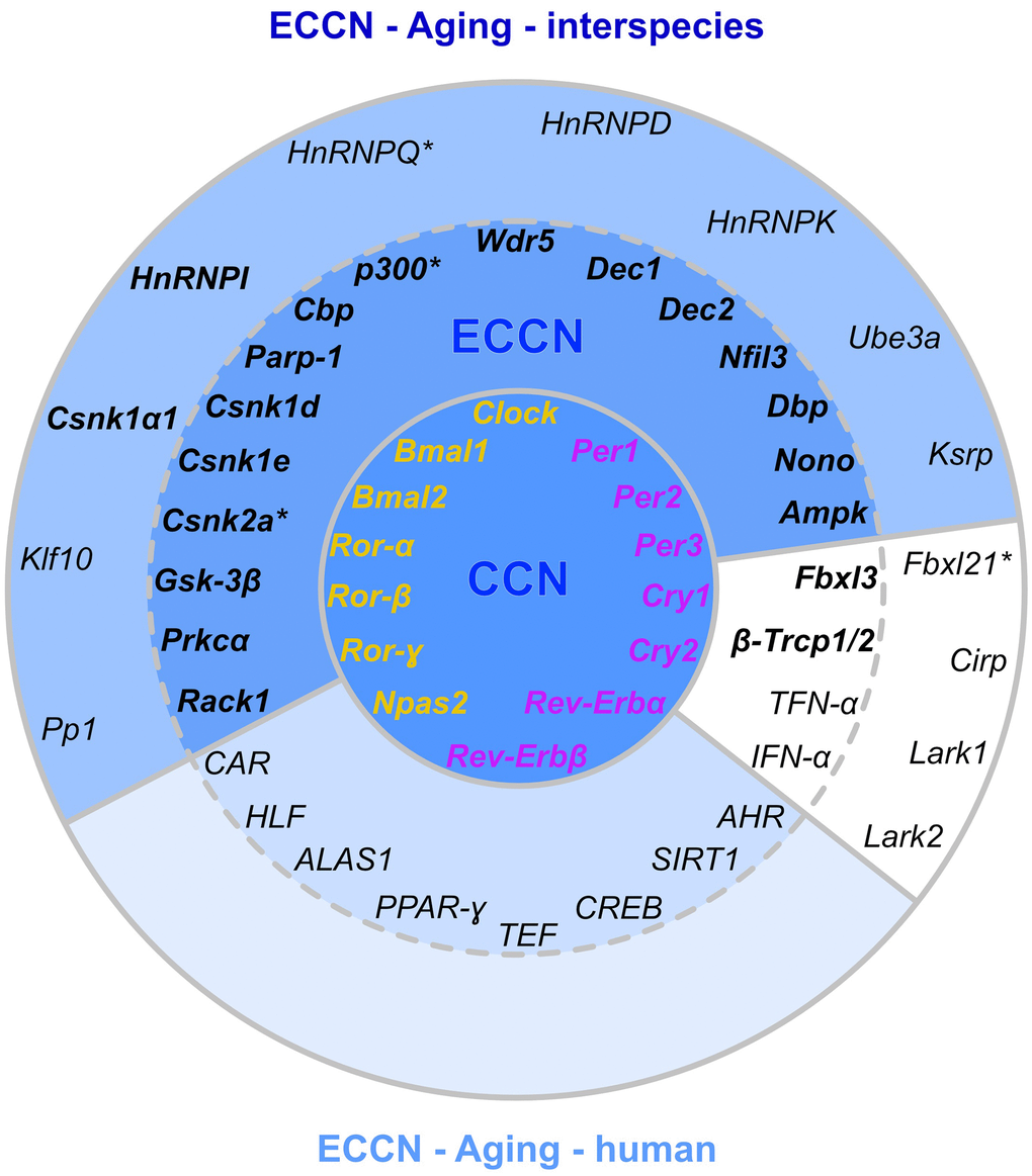 The underlying input inter-connectome of a core clock (CCN) and an extended core clock network (ECCN) implementing update connections according to PubMed-available data comprised 43 CR-related elements displaying more than 200 regulatory interdependencies [83, 84]. First, when mapping our 46 CR-related genes (Figure 3), 42 out of which proved to be differentially expressed during the aging process, we identified that all of the 14 CR genes nominated to be engaged in the CCN in humans [84] were represented in the category of core clock regulators and immediate transcriptional regulators in our inter-species study. This 100% overlap covered both the positive and negative branches of the circadian feedback loop (Figure 6). Second, as for the ECCN, 19 out of 29 (65.5%) CR-related elements designated to belong to the human ECCN [84] overlapped with the DEGs nominated as CCN interaction partners in our inter-species approach (Figure 6). Third, among the 118 genes, newly nominated by Lehmann and colleagues to be potential ECCN targets and thus becoming part of their innovative, most comprehensive NCRG in humans, we found 2 of them, i.e., Csnk1α1 and HnRNPI, to overlap with our DEGs output. As the reference network established by Lehmann and colleagues is not tissue-specific, we could not match for inter-tissue peculiarities.
