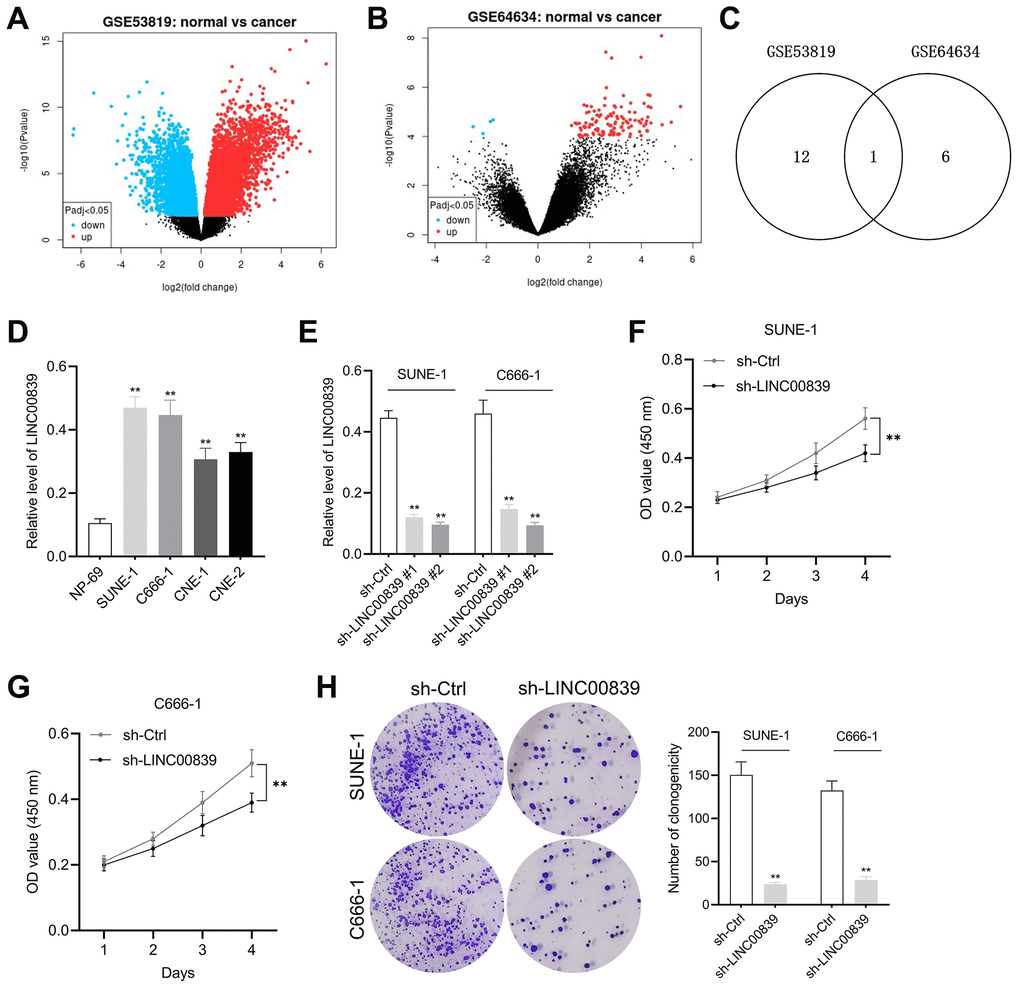 Two NPC-related GEO microarray chip data (GSE53819 and GSE64634) were screened for the identification of all differentially expressed genes (DEGs). The screening criteria by which the DEGs shown in the figure were identified were |log2 fold change|≥ 1 and P-value <0.05. Volcano plot displayed the DEGs in GSE53819 and GSE64634 (Figure 1A, 1B). Of these DEGs, total 342 differentially expressed lincRNAs in GSE53819 and 786 differentially expressed in GSE64634. According to the screening condition of fold change ≤ −1 and P < 0.05, 13 upregulated lincRNAs in GSE53819 and 7 upregulated lincRNAs in GSE64634 were obtained. Venn diagram was used to fine the intersection lincRNAs and LINC00839 was one of them (Figure 1C). To verify the expression pattern of LINC00839 in NPC, qPCR was performed to measure LINC00839 levels in NPC cell lines. As illustrated in Figure 1D, compared with normal cell line NP-69, LINC00839 expression was markedly elevated in NPC cell lines (SUNE-1, CNE-1, C666-1, and CNE-2). Then, SUNE-1 and C666-1 cells were transfected with sh-LINC00839 #1 or sh-LINC00839 #2. qPCR assay was performed to monitor the transfection efficiency (Figure 1E). We noted that sh-LINC00839 #2 exhibited higher shRNA transfection efficiency when compared with the sh-LINC00839 #1. Therefore, we chose to perform in vitro experiments with sh-LINC00839 #2 transfected cell line. In MTT assay, LINC00839 knockdown attenuated SUNE-1 and C666-1 cells proliferation (Figure 1F, 1G). Similarly, LINC00839 knockdown attenuated the clonogenic abilities of C666-1 and SUNE-1 cells in vitro (Figure 1H). These results demonstrate LINC00839 is upregulated in NPC and LINC00839 knockdown inhibits NPC cells growth in vitro.