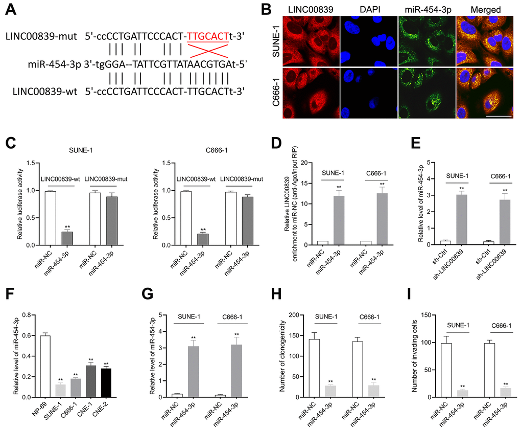 With the research on online bioinformatics database (starBase v2.0), we found miR-454-3p was predicted to have complementary base pairing with LINC00839 (Figure 3A). Subsequently, the FISH assay was carried out, and the results displayed that miR-454-3p and LINC00839 were colocalized in the cytoplasm of SUNE-1 and C666-1 cells (Figure 3B). To verify the target binding of miR-454-3p and LINC00839, we constructed luciferase reporter vectors containing the predicted wild-type (wt) or mutant (mut) binding sites of miR-454-3p on LINC00839 (named as LINC00839-wt and LINC00839-mut). As shown in Figure 3C, the luciferase activity was declined in NPC cells co-transfected with miR-454-3p mimic and LINC00839-wt. Ago2-RIP assay further showed LINC00839 enrichment was more pronounced in miR-454-3p overexpression group than that in the miR-NC group (Figure 3D). Moreover, LINC00839 silencing remarkedly increased the level of miR-454-3p (Figure 3E). In comparison with NP-69 cell, miR-454-3p was highly expressed in NPC cells as demonstrated by qPCR analysis (Figure 3F). SUNE-1 and C666-1 cells were transduced with miR-NC or miR-454-3p mimic (miR-454-3p). As shown in Figure 3G, miR-454-3p was dramatically upregulated in C666-1 and SUNE-1 cells. Subsequently, we observed that miR-454-3p mimic decreased the clone formation capacity in NPC cells (Figure 3H). In terms of the capacity of cell invasion, Transwell assays showed that invasive cells were declined in miR-454-3p-overexpressed NPC cells (Figure 3I). Collectively, these findings successfully suggest that miR-454-3p is downregulated in NPC and exerts the tumor suppressor role in NPC.