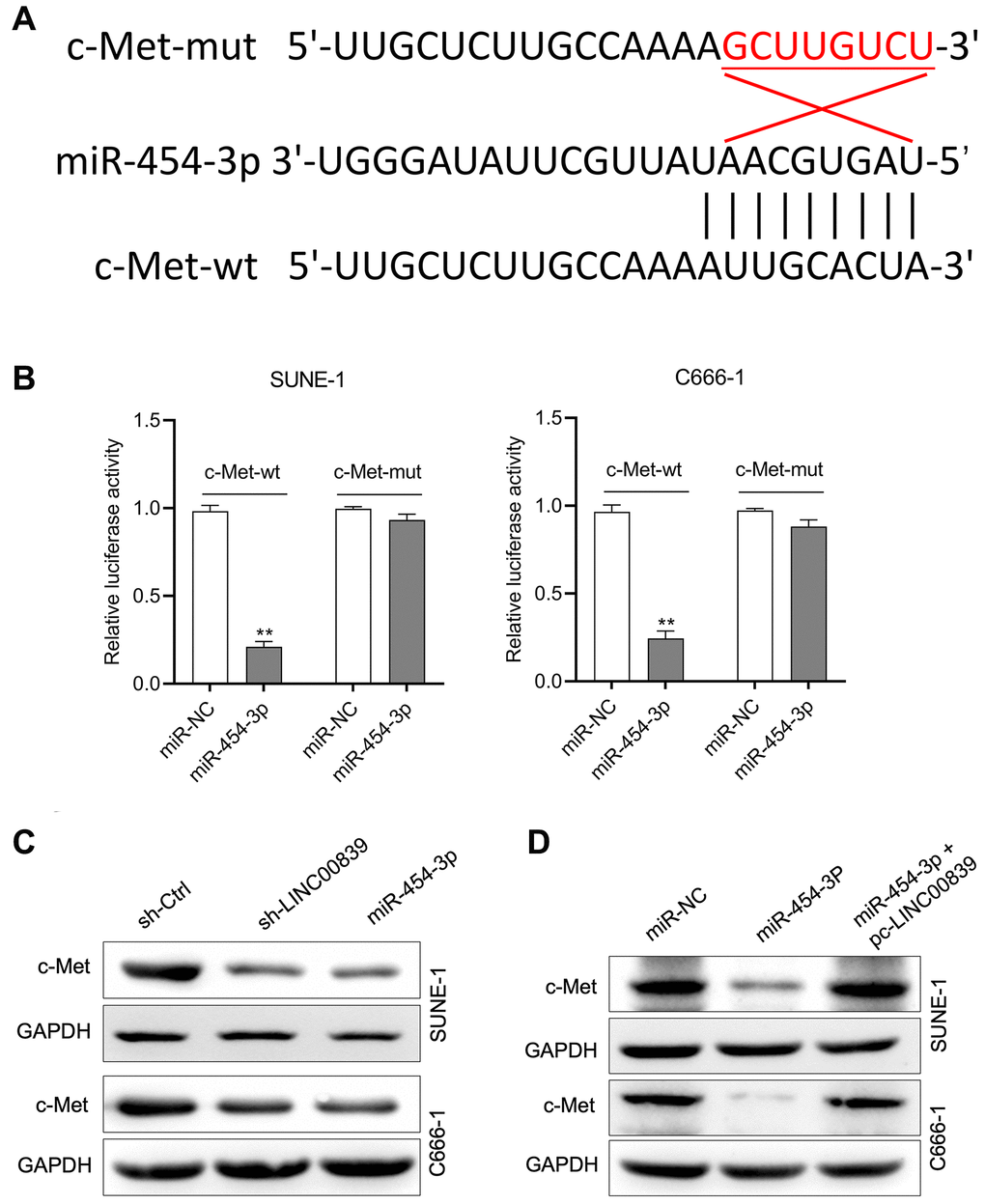 According to in silico data on TargetScan Human (TargetScan Human release 7.2), the putative target genes of miR-454-3p were investigated and bioinformatics analysis indicated that human c-Met was a potential target of miR-454-3p (Figure 4A). To confirm this prediction, c-Met 3′-UTR wild type (c-Met-wt) and mutant (c-Met-mut) reporter plasmids were constructed, and the luciferase reporter gene test was conducted. The luciferase activity in cells transfected with c-Met-wt rather than c-Met-mut was remarkably reduced by miR-454-3p mimic (Figure 4B). Additionally, the regulatory effect of LINC00839 and miR-454-3p on c-Met expression was determined by immunoblotting. The result showed that c-Met expression was inhibited when cells were transfected with miR-454-3p or sh-LINC00839 (Figure 4C). In co-transfection group, re-introducing LINC00839 (pc-LINC00839) almost restored the expression level of c-Met in miR-454-3p mimic transfected NPC cells (Figure 4D). Altogether, these findings demonstrate that LINC00839 serves as a “sponge” through competitively binding to the endogenous miR-454-3p.