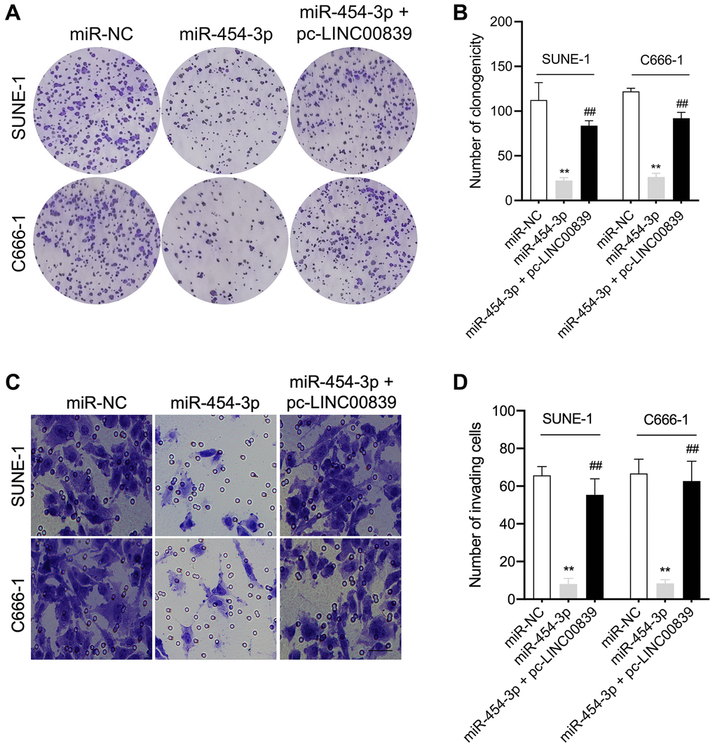 To further explore the mechanism of LINC00839 in affecting the malignancy of NPC, the rescue experiments using pcDNA3.1-LINC00839 plasmid (pc-LINC00839) were performed to ascertain the role of LINC00839 in mediating the biological action of miR-454-3p in NPC cells in vitro. SUNE-1 and C666-1 cells co-transfected with pc-LINC00839 and miR-454-3p. Transfection cells were divided into three groups: miR-NC, miR-454-3p mimic and pc-LINC00839 + miR-454-3p (Figure 4D). In miR-454-3p mimic group, cells exhibited lower cell colony formation, which was rescued by upregulation of LINC00839 (Figure 5A, 5B). Cell invasion ability was rescued in pc-LINC00839 + miR-454-3p group, compared to cells treated with miR-454-3p mimic (Figure 5C, 5D). These observations reveal a novel LINC00839/miR-454-3p axis in NPC development.