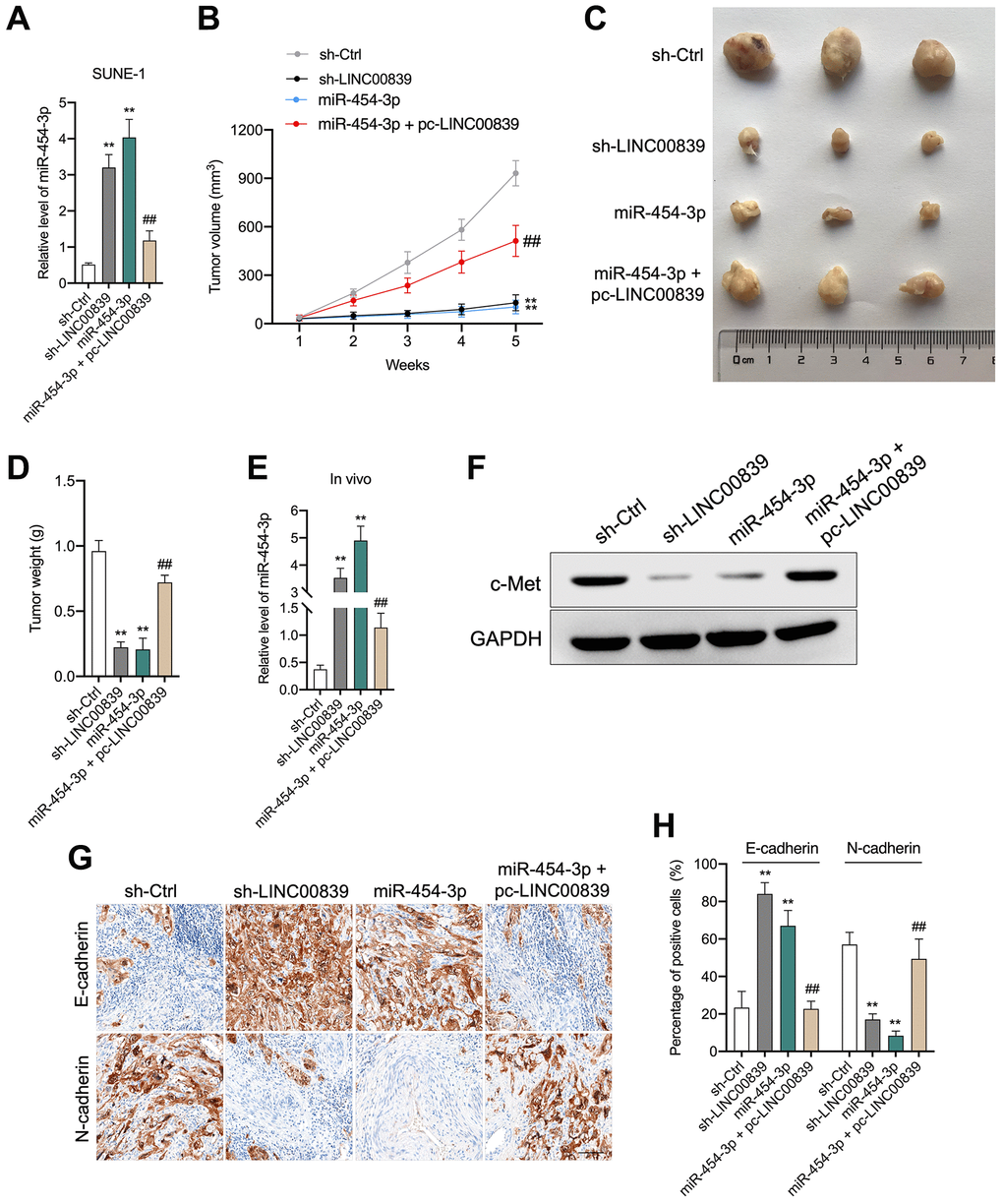Our in vitro findings corroborated that LINC00839 act as a “ceRNA” for miR-454-3p. To confirm our results in vivo, a nude mice xenograft experiment was implemented. SUNE-1 cells were transfected with sh-LINC00839 or miR-454-3p mimic and then were subcutaneously inoculated into nude mice (Figure 6A–6C). Another group of mice was inoculated with miR-454-3p mimic + pc-LINC00839 co-transfected SUNE-1 cells. After 5 weeks, compared with the sh-Ctrl group, the tumor growth rate was inhibited in sh-LINC00839 group and miR-454-3p group. When compared with the miR-454-3p group, SUNE-1 cells growth in vivo was restored in mice injected with miR-454-3p mimic + pc-LINC00839 co-transfected cells (Figure 6B, 6C). Similarly, the weight of xenograft tumors also showed the same trend (Figure 6D). The level of miR-454-3p was raised in sh-LINC00839 group and miR-454-3p group. The level of miR-454-3p increased by miR-454-3p was counteracted in tumor tissue formed by miR-454-3p + pc-LINC00839 co-transfected SUNE-1 cells (Figure 6E). Furthermore, c-Met expression was extremely downregulated in sh-LINC00839 group and miR-454-3p group. The expression of c-Met decreased by miR-454-3p was restored in mice inoculated with miR-454-3p + pc-LINC00839 co-transfected SUNE-1 cells (Figure 6F). Besides, the expression of N-cadherin was abundantly attenuated by sh-LINC00839 and miR-454-3p transfection whereas the expression of E-cadherin was raised as demonstrated by immunohistochemical staining (Figure 6G, 6H). When compared with those in the miR-454-3p group, the protein expression patterns of E-cadherin and N-cadherin were reversed by pc-LINC00839. These data demonstrated the tumor-suppressive role of LINC00839 knockdown in NPC tumor growth.
