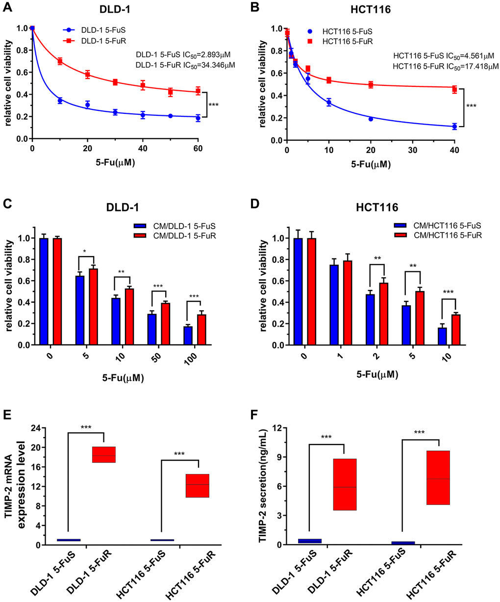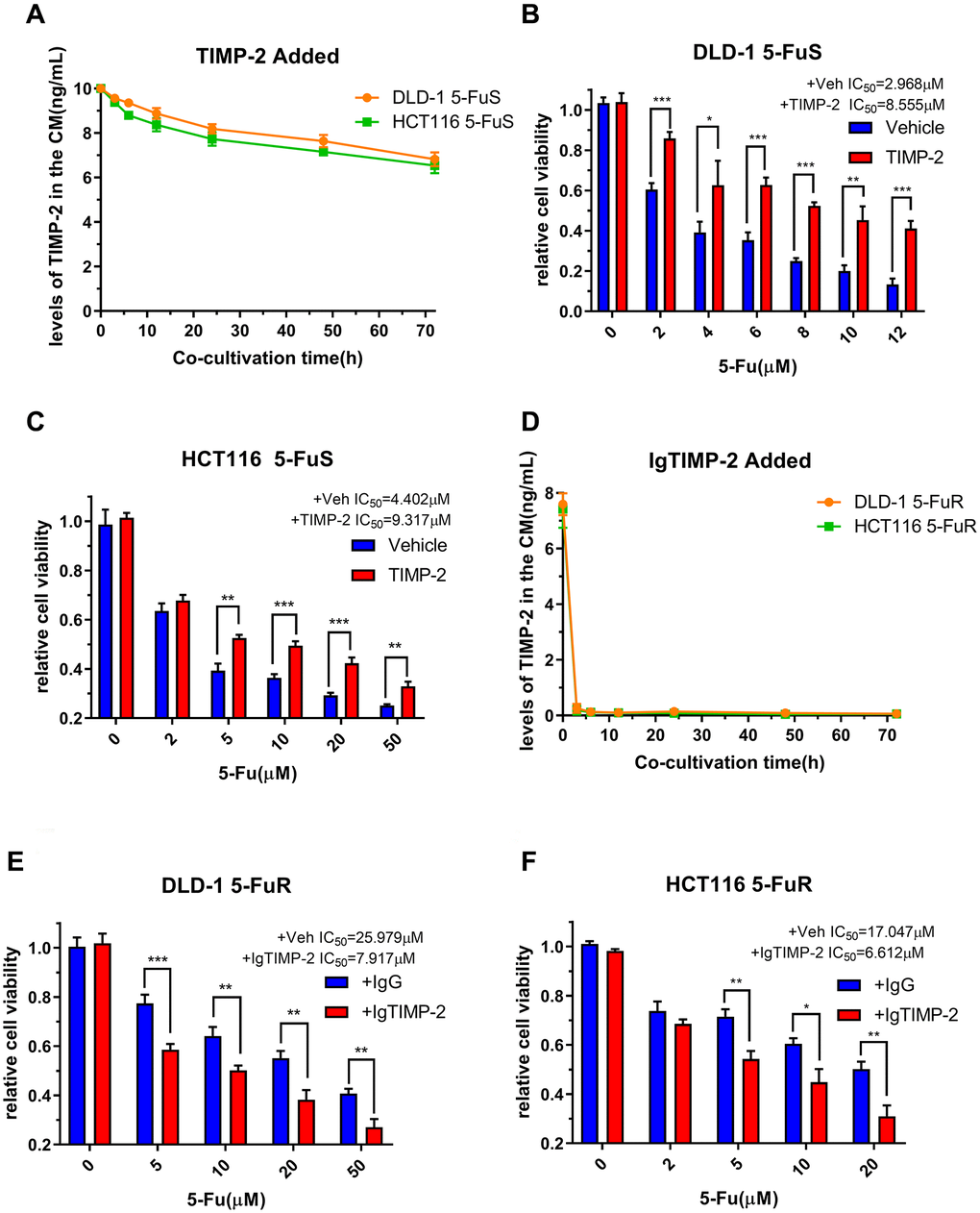 To determine whether TIMP-2 protein is involved in drug-resistance, we assessed the expression levels of TIMP-2 by real-time quantitative PCR and ELISA. Semi-quantitative mRNA analysis showed that TIMP-2 transcription levels in drug-resistant cell lines were significantly higher than those of sensitive cell lines (Figure 2E). Assessment of TIMP-2 protein levels by ELISA showed that it was highly secreted in drug-resistant cell lines, including DLD-1 5-FuR and HCT116 5-FuR (Figure 2F).