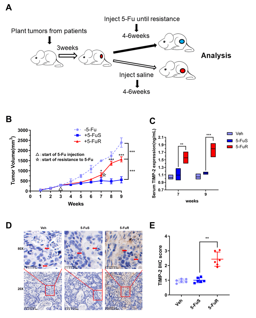 To further show that TIMP-2 was also up-regulated during 5-Fu treatment in vivo, we used patient-derived xenograft (PDX) models. The PDX model maintains the donor's original biological behaviors and molecular characteristics [54–57]. Following the necessary construction processes, we constructed a PDX model of colorectal tumor with resistance to 5-Fu (Figure 3A). When the experimental group was treated with 5-Fu, subcutaneous tumors in the experimental group (5-FuS and 5-FuR group) began to be under control. After about 4 weeks of treatment, subcutaneous tumors of 5-FuS group PDX mice began to be resistant to 5-Fu, implying that the PDX model of colorectal tumor with resistance to 5-Fu had successfully been constructed (Figure 3B). TIMP-2 protein levels in the serum of 5-Fu-resistant PDX models were found to be significantly higher than those of sensitive strains (Figure 3C). Immunohistochemical (IHC) analysis showed that tumor tissues, which showed elevated TIMP-2 expression levels exhibited resistance to 5-Fu (Figure 3D). Semi-quantitative immunohistochemical analysis further affirmed these results (Figure 3E). Similar results were obtained from tested patient serum.