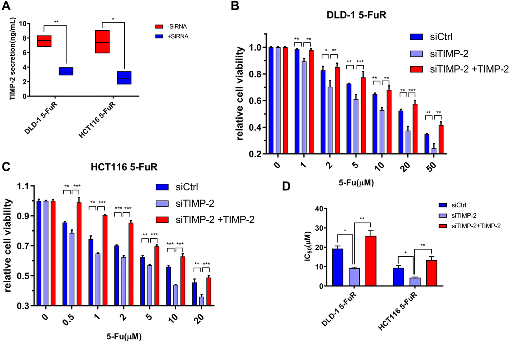 To validate the relationship between 5-Fu resistance and TIMP-2 protein expression levels in colorectal tumors, we used small interfering RNA (siRNA) to knock down TIMP-2 expression in cell lines. siRNA against TIMP-2 showed excellent knock-down efficiency in DLD-1 5-FuR and HCT116 5-FuR cells (Figure 5A). Besides, DLD-1 5-FuR and HCT116 5-FuR cells regained sensitivity to 5-Fu after knock-down of TIMP-2 expression by siRNA (Figure 5B and 5C). Remarkably, the higher the concentration of 5-Fu in the culture solution, the more apparent the above effect. Addition of recombinant TIMP-2 protein to the siRNA-treated DLD-1 5-FuR and HCT116 5-FuR cells restored the resistance of cell lines to 5-Fu (Figure 5B and 5C). The IC50 for each group of cells in the above experiment are shown in Figure 5D. These results show that TIMP-2 induces 5-Fu resistance in CRC cells.
