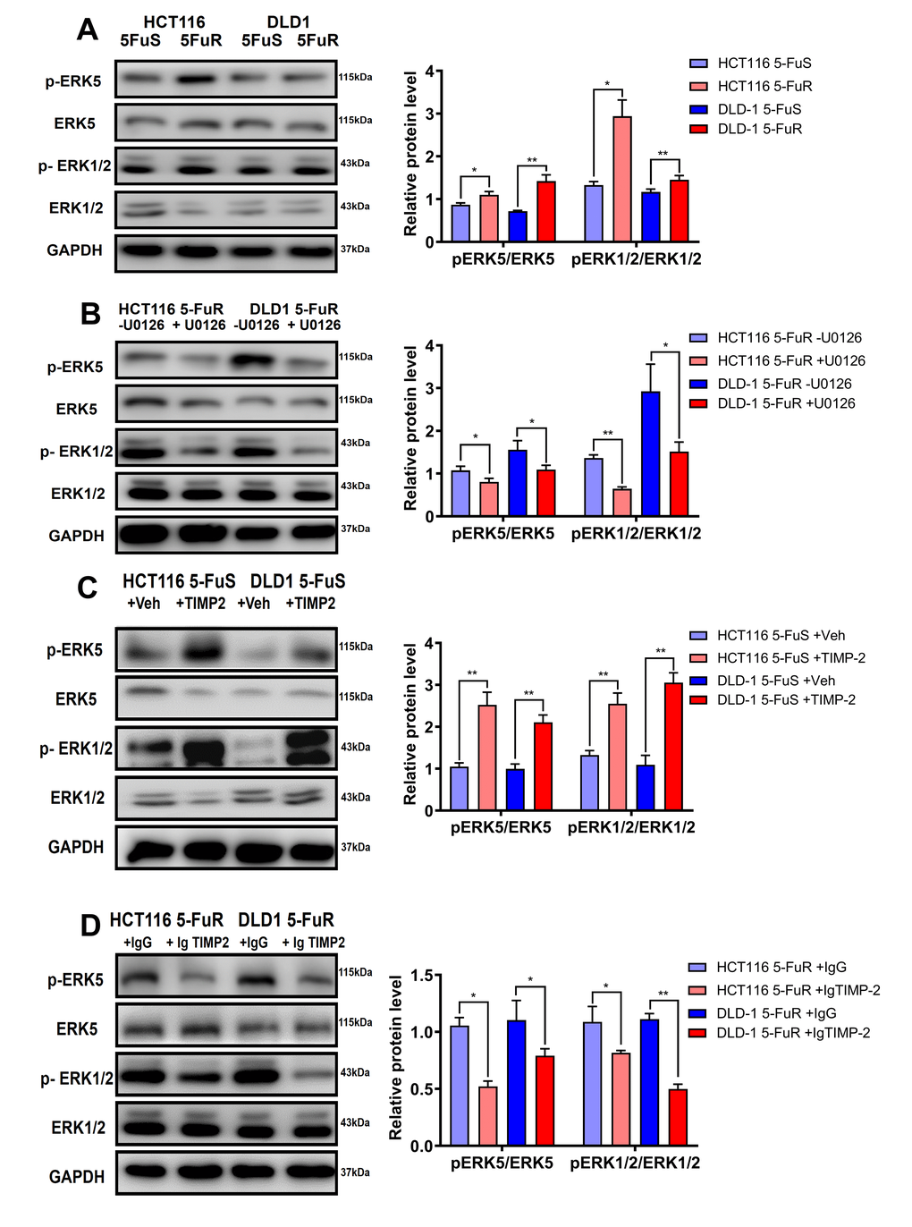 To confirm the effects of the ERK/MAPK signaling pathway on drug resistance in CRC, we performed a series of experiments. U0126 is an ERK/MAPK signaling pathway inhibitor. Phosphorylation of ERK1/2 and ERK5 in both DLD-1 5-FuR and HCT116 5-FuR cells were markedly inhibited by U0126 treatment (Figure 6B). Moreover, we evaluated the role of TIMP-2 in activation of the ERK/MAPK signaling pathway in CRC cells. Recombinant TIMP-2 treatment significantly enhanced ERK1/2 and ERK5 phosphorylation in both DLD-1 5-FuS and HCT116 5-FuS cells (Figure 6C). However, addition of TIMP-2 neutralization antibody resulted in significantly decreased phosphorylation levels of ERK1/2 and ERK5 in both resistant cell lines (Figure 6D).