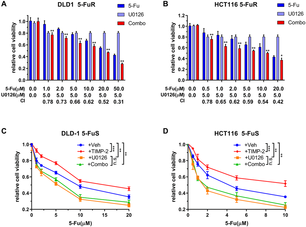 Therefore, combined use of an agent targeting TIMP-2 and 5-Fu has the potential for preventing or treating CRC resistance to 5-Fu in CRC patients. Alternatively, small molecule inhibitors that target the ERK/MAPK signaling pathway, such as U0126, can effectively cut off the pathway, thereby increasing sensitivity of colorectal tumors to 5-Fu. However, studies involving animal experiments and clinical trials should be performed to ascertain these findings.