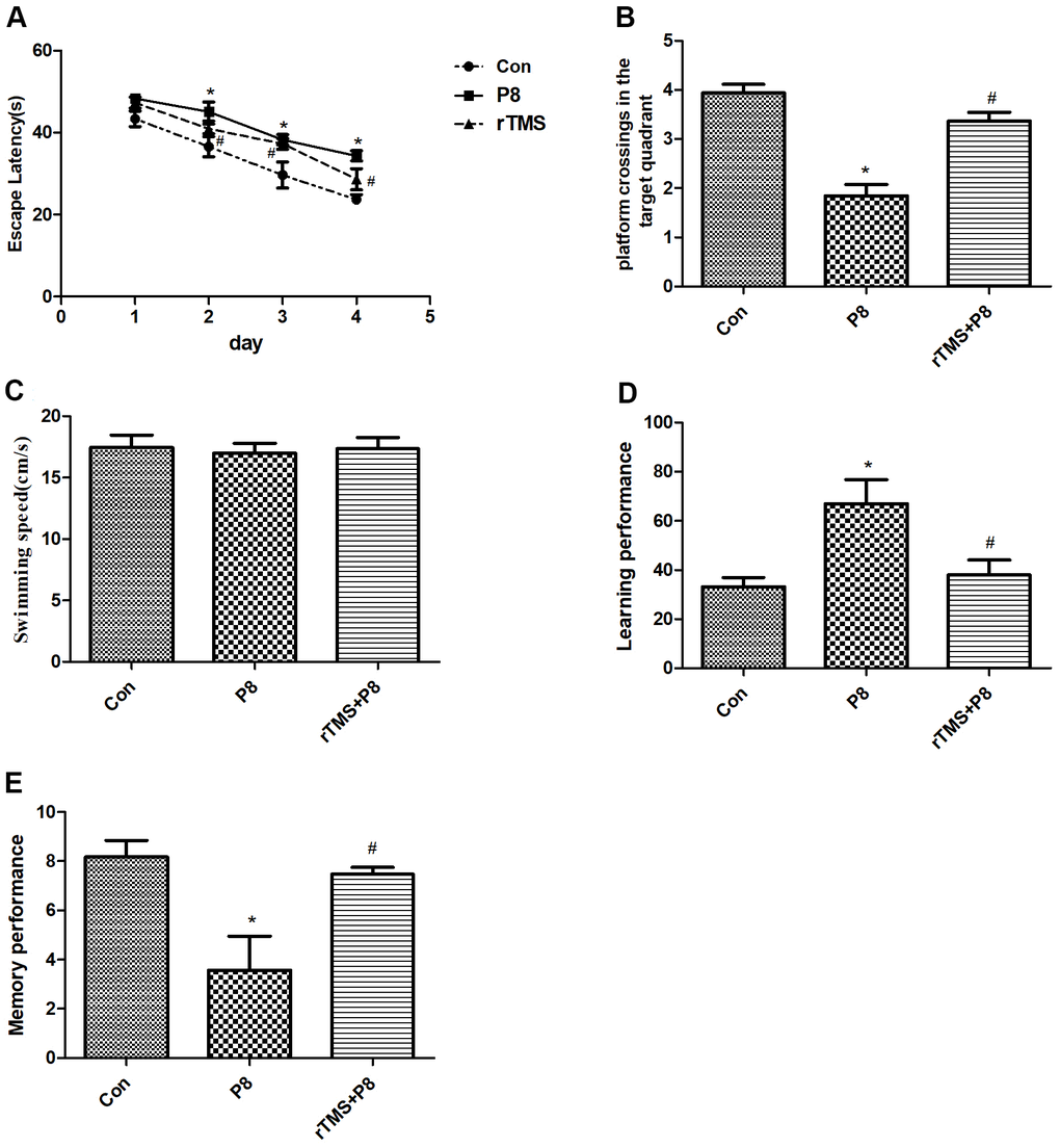To exclude the effects of rTMS on mice with cognitive deficits, MWM test was performed at 1-5 days after rTMS treatment in the three groups. In the orientation navigation experiment, we found significant differences in latency time between the Con group and P8 group, and the latency time of the P8 group was much longer than that of the Con group. However, the latency time was significantly decreased in the rTMS group compared with the P8 group (Figure 1A). In the spatial probe test, compared with the Con group, the platform crossings of the P8 group in the target quadrant were shortened, while rTMS prolonged the crossings of P8 mice in the platform quadrant (Figure 1B). However, no difference in swimming speed was observed between the three groups (Figure 1C). The Y-maze test was performed to assess the cognitive function of all animals. Compared with the Con group, the number of training required to reach the 9/10 standard in the P8 group was significantly increased, and the learning and memory performance was significantly decreased; the learning and memory scores of the rTMS group were significantly improved compared with those of the p8 group (Figure 1D, 1E). The results showed that rTMS improved cognitive disorders of in Alzheimer's disease which improved the performance of the mice.