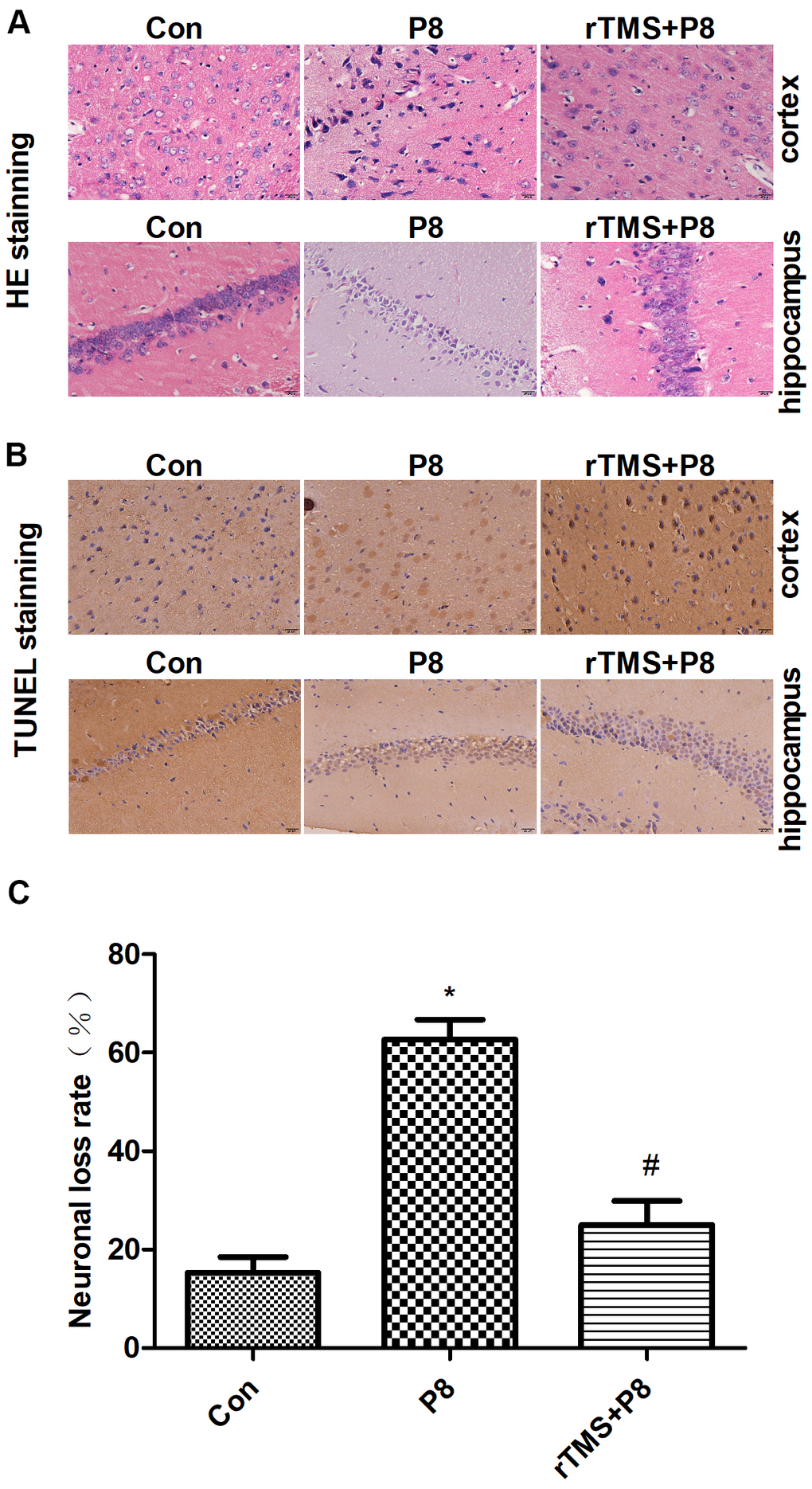 Morphological changes in cortical and hippocampal neurons were observed by HE staining. As shown in the HE staining results (Figure 2A), cortical and hippocampal neurons in the Con group were arranged in an orderly manner, chromatin was evenly distributed and nucleoli were clearly visible. In the P8 group, we observed a completely opposite pattern to the Con group. After rTMS treatment, the levels of neuron degeneration, necrosis, and loss were reduced compared with those in the P8 group. Then, TUNEL staining was used to observe the effect of rTMS on the apoptosis of cortical and hippocampal cells. As shown in Figure 2B, 2C, a small number of cortical and hippocampal neurons in the control group suffered apoptosis. In the P8 group, disordered neuronal cell arrangement was observed and the number of apoptotic cortical and hippocampal neurons increased. After rTMS treatment, the apoptotic neurons of P8 mice were significantly reduced. The results indicated that the improvement of learning and memory impairment by rTMS may be related to the reduction of neuron loss.