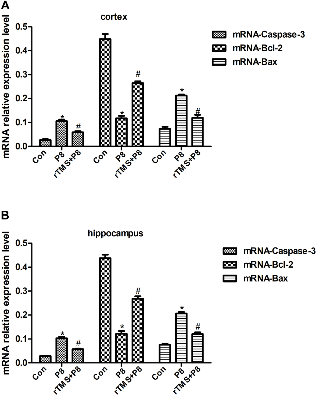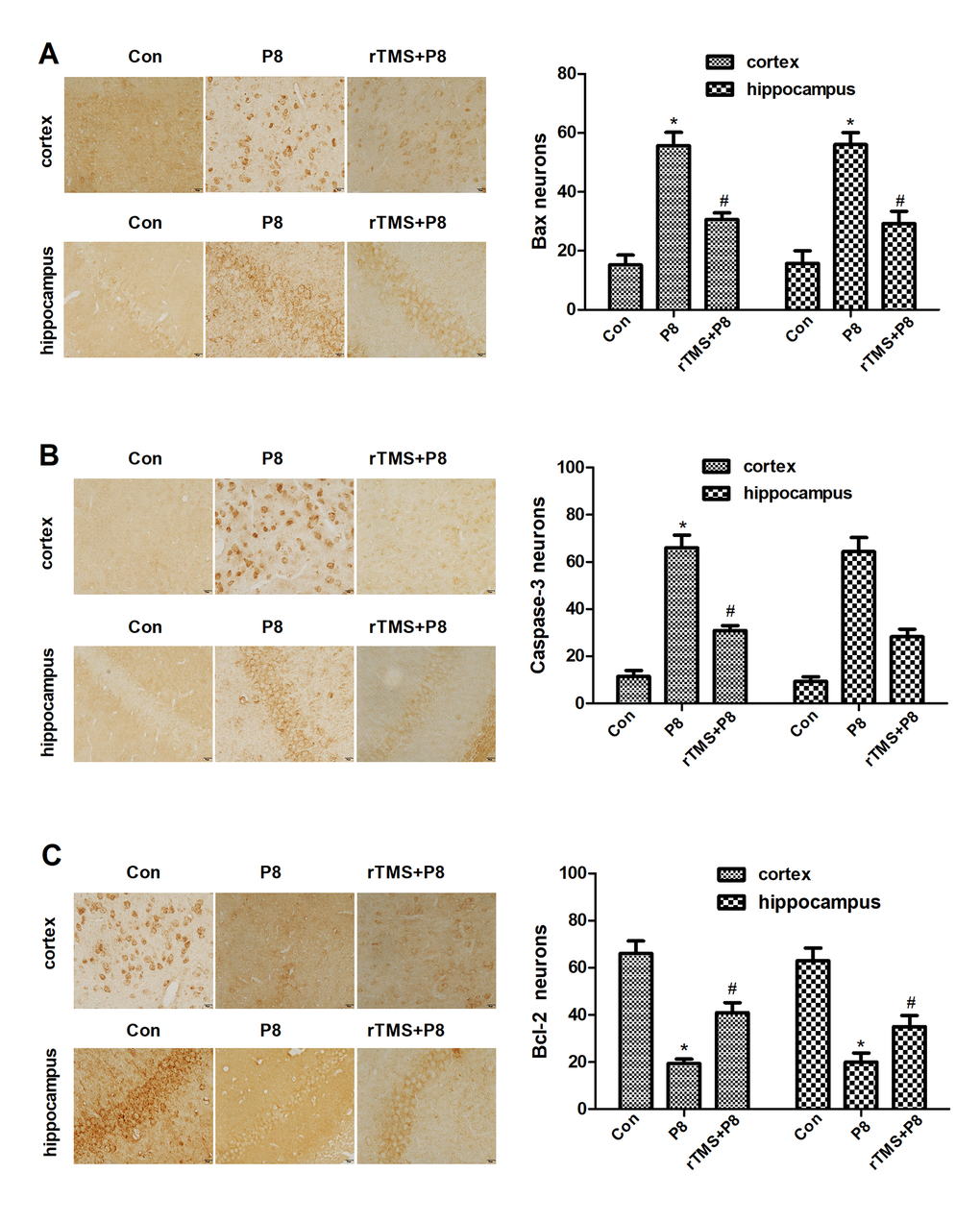 Reduction in the apoptosis of cortical and hippocampal neurons of P8 mice after rTMS treatment