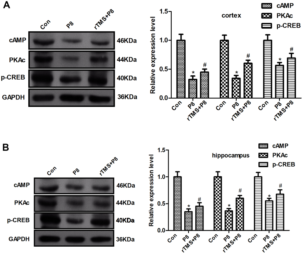 To further determine whether the cAMP/PKA/CREB pathway participates in rTMS-related action, the expression of cAMP, PKAc, and CREB in mouse cortical and hippocampal tissue was determined by western blot. As shown in Figure 5, AD significantly decreased the cAMP, PKAc, and p-CREB expression, whereas rTMS increased the expression of cAMP, PKAc, and p-CREB. Taken together, these results demonstrated that the cAMP/PKA/CREB pathway might be involved in the rTMS-induced changes in cortical and hippocampal tissue.