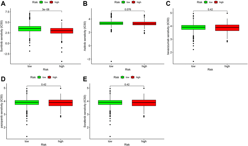 Targeted therapy drugs are the first-line therapy for patients with advanced ccRCC. We also analyzed the relationship between the risk coefficient scoring model and the sensitivity of targeted therapy drugs. The IC50 was used to evaluate the efficacy of drugs. Lower IC50 suggests higher sensitivity. We found that the high-risk group was associated with higher sensitivity of sunitinib (Figure 10A), which was statistically significant (P = 3 e-08); axitinib (Figure 10B), bevacizumab (Figure 10C), pazopanib (Figure 10D), and sorafenib (Figure 10E) were not significantly different in the high- and low-risk groups.