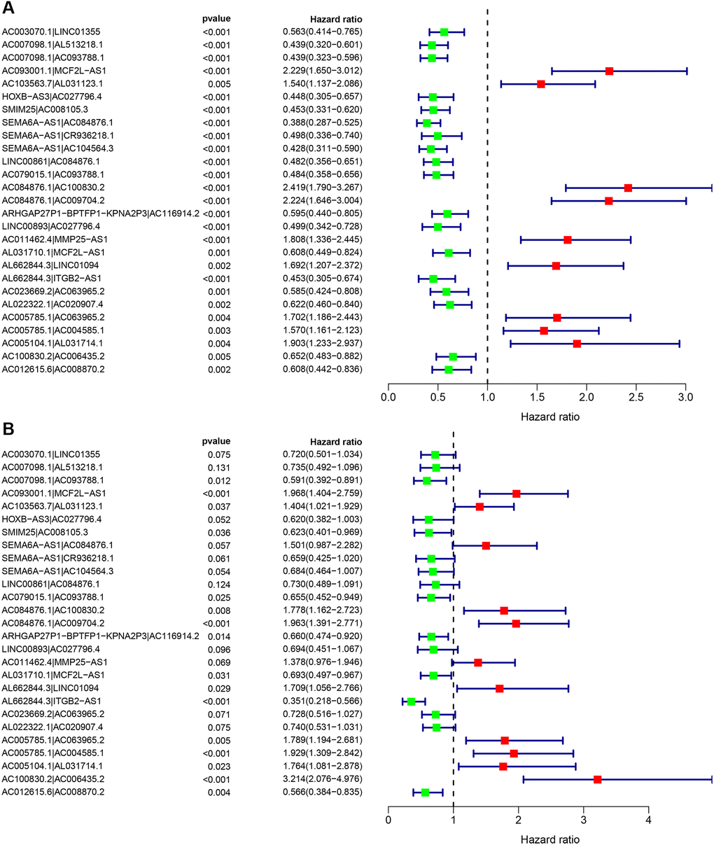 By matching the 90 differentially expressed immune lncRNA pairs for multiple cycles, a total of 2663 differentially expressed immune lncRNA pairs were obtained. Next, 27 immune lncRNA pairs were identified using least absolute shrinkage and selector operation (LASSO) regression analysis and Cox univariate regression analysis (Figure 3A). Then, a Cox multivariate regression analysis was performed based on these 27 immune lncRNA pairs, 16 of which can participate in constructing the risk coefficient scoring model (Figure 3B) and the risk coefficient of each immune lncRNA pair was obtained (Table 2).