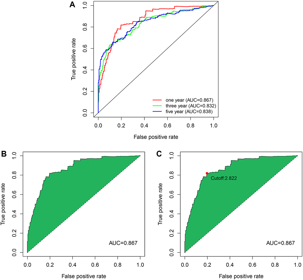 ROC curves were constructed using the survivalROC package of the R software, which included ROC for 1-, 3-, and 5- years and the AUC values were calculated to determine the value predicted by the model. We found that the 1-year ROC curve had the largest AUC value. According to the AIC best fit [35], it was possible to distinguish low-risk with high-risk patients by finding a critical value with the largest sum of specificity and sensitivity.