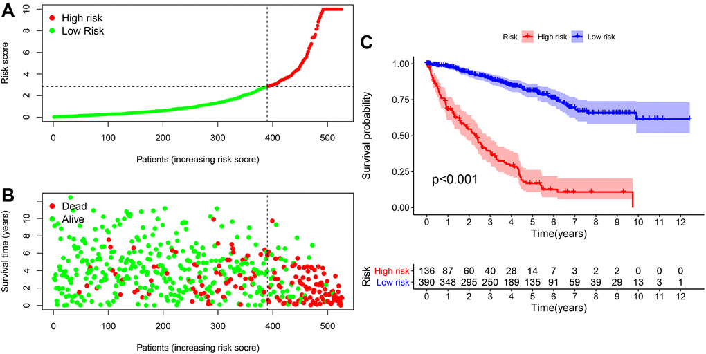 The relationship between the risk factor score and the risk subgroup patients ccRCC was analyzed via R language software (Figure 5A). According to the time process, the relationship between the patient’s survival status and the risk coefficient score were obtained (Figure 5B), and the Kaplan-Meier curve was constructed according to the survival status of the high- and low-risk groups (Figure 5C). The result was that the survival rate of patients in the low-risk group was significantly higher than that in the high-risk group (P < 0.001).
