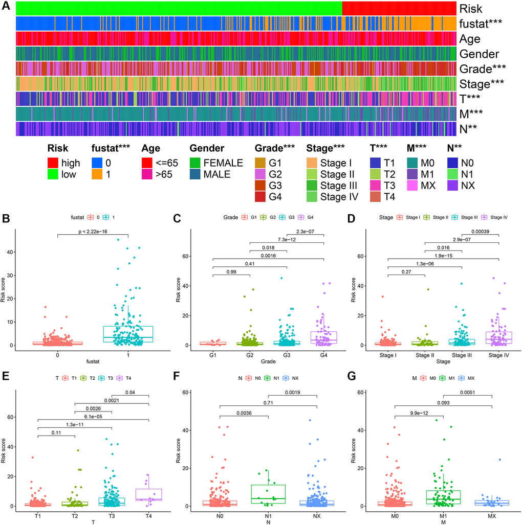 The heatmap in Figure 6A described the relationship between the level of risk scores and clinically relevant indicators. We found that the survival status of patients with ccRCC (P < 0.001), tumor grade (P < 0.001), tumor stage (P < 0.001), T stage (P < 0.001), M stage (P < 0.001), and N stage (P < 0.01) were related to risk coefficient score significantly. It can be seen from the box plot we constructed that ccRCC patients with a higher risk factor had a higher chance of death (Figure 6B). Furthermore, tumor grade (Figure 6C), tumor clinical stage (Figure 6D), T stage (Figure 6E), N stage (Figure 6F), and M stage (Figure 6G) were also higher.