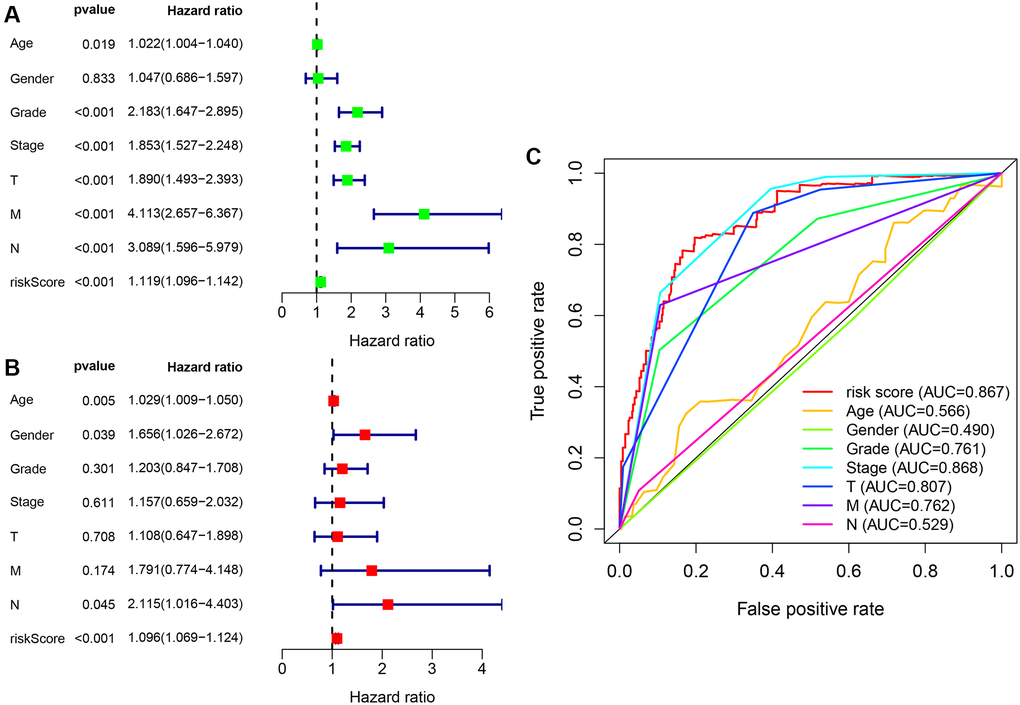 A Cox univariate and a multivariate regression analysis were performed on the risk score and clinical correlation indicators. Then the R language software’s survival package was used to visualize the data, and forest maps were done (Figure 7A and Figure 7B). It was found that the tumor grade, tumor stage, TNM stage, and risk coefficient score were related to the outcome of the Cox univariate analysis, but in the Cox multivariate analysis, age, gender, and risk coefficient score were independent predictors of outcome. The ROC curve of clinical-related indicators and the 1-year risk coefficient score were compared in the same chart (Figure 7C). The result was that the patient’s risk coefficient score (AUC = 0.867) and tumor stage (AUC = 0.868) had the highest predictive efficacy.