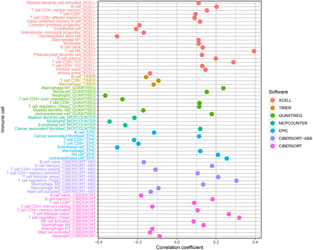To analyze the relationship between risk factor score and immune cell infiltration, the immune cell infiltration data of patients with ccRCC in TCGA was calculated based on CIBERSORT (http://cibersort.stanford.edu/) [36], TIMER (version 2.0; http://timer.cistrome.org/) [37], QUANTISEQ (http://icbi.at/quantiseq) [38], Microenvironment Cell Populations-counter [39], EPIC (http://epic.gfellerlab.org) [40], and XCELL (http://xCell.ucsf.edu/) [41]. The correlation between immune cell infiltration data and risk coefficient score was analyzed using the limma, scales, ggplot2, and ggtext packages of R software, which can be visualized to obtain a bubble chart according to P < 0.05 as the identifying criterion.