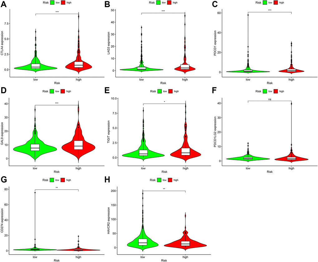 We found that CD274, CTLA4, HAVCR2, LAG3, LGALS9, PDCD1, PDCD1LG2, and TIGIT were abundantly expressed in ccRCC samples. To determine whether these genes differed between the high- and low-risk groups of the risk model, the limma and ggpubr packages of the R language software were used to analyze and visualize the data using violin charts.