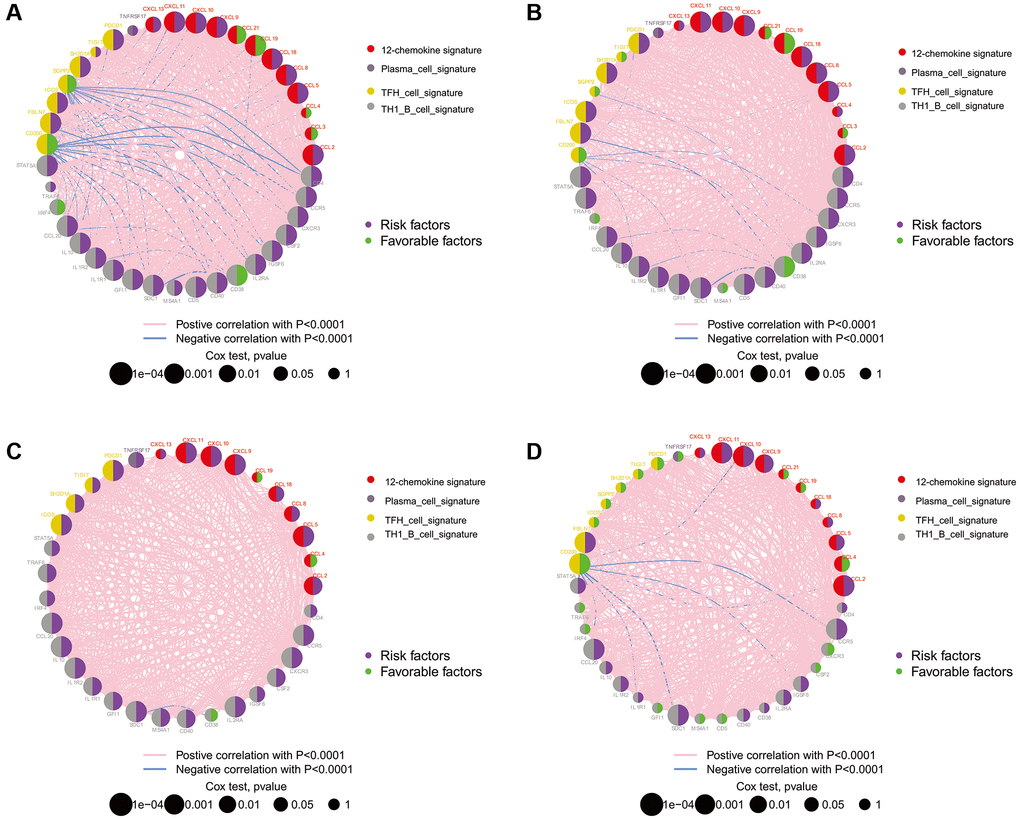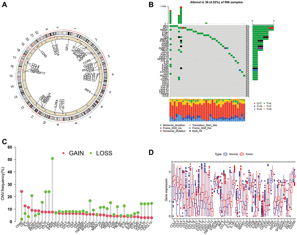 The locations of CNVs and CNV frequency in TLS genes were determined (Figure 1A and 1C). Among 896 glioma patients, only 36 (4.02%) patients harbored somatic mutations in TLS genes (Figure 1B). We evaluated the gene expression profile of TLS genes in glioma and normal tissues (TCGA vs. GTEx). We found that the expression levels of CXCL2, CCL3, CCL4, CCL5, CCL8, CCL18, CXCL9, CXCL8, CXCL11, CXCL13, CD4, CCR5, CXCR3, CSF2, IGSF6, IL2RA, CD38, CD5, SDC1, GFI1, IL1R1, IL10, CCL20, IRF4, TRAF6, STAT5A, ICOS, SH2D1A, TIGIT, PDCD1 were higher in glioma tissues than in normal tissues (Figure 1D, p < 0.001); however, CXCL19, CXCL21, TNFRSF17, IL1R2, MS4A1, CD40, SGPP2, CD200, and FBLN7 were downregulated in glioma tissues (p < 0.001). Survival analysis indicated that 36 of these 40 genes were associated with the prognosis of glioma in the TCGA cohort (Figure 2A, p < 0.05), the genes associated with the prognosis of glioma were identified in CGGA_cohort1, CGGA_cohort2, and GSE16011 (Figure 2B–2D).