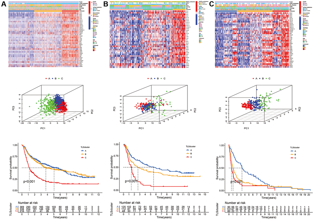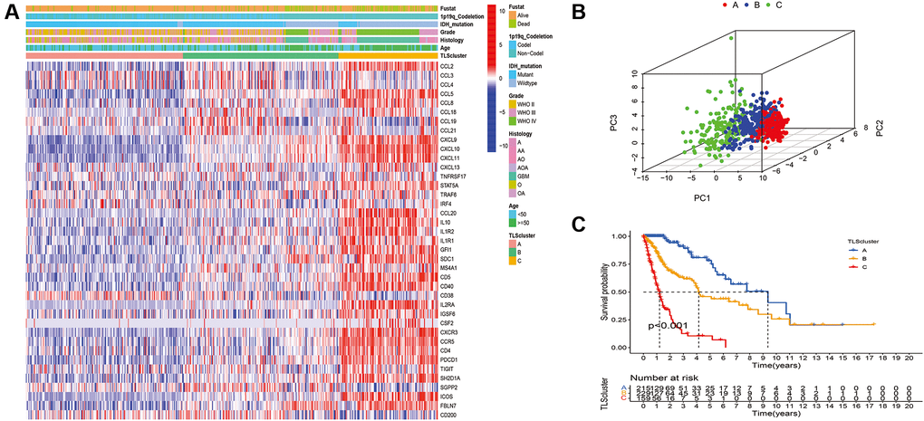 To characterize TLS heterogeneity in gliomas, the 40 TLS genes were used to perform clustering analysis (Supplementary Figure 1). Three clusters (A, B, and C) were identified based on consensus clustering on the gene expression profile of TLS genes (Figure 3A). PCA was carried out to confirm the assignments of subtypes and validate the differences in expression characteristics among the three TLS subtypes (Figure 3B). There was a significant prognostic difference among the clusters, with a shorter survival for C than B and A (Figure 3C, p < 0.001).