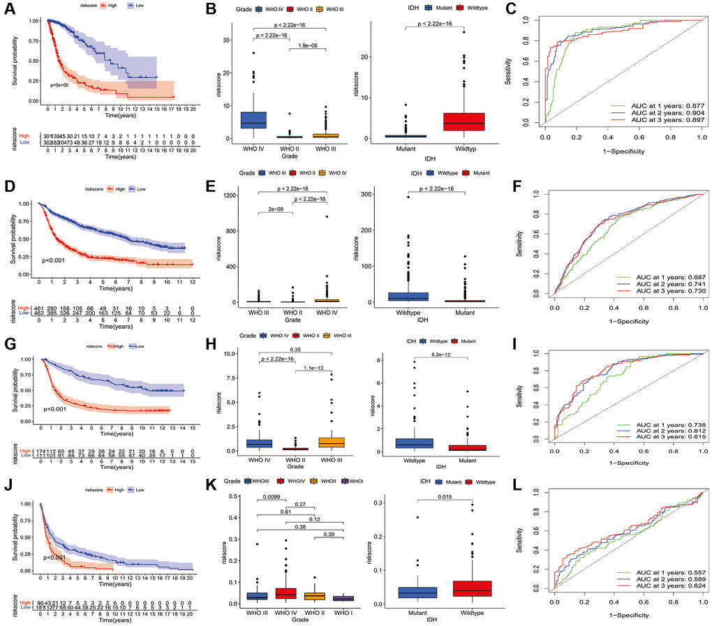 To further analyze the characteristics of the three subtypes, genes with differential expression within subtypes were enquired with the R package “samr”. There were 5151 intersection genes between the A and B subtypes, A and C subtypes, and B and C subtypes in the TCGA cohort (Figure 7A). The intersection genes between subtypes in CGGA_cohort1 (Figure 7B), CGGA_cohort2 (Figure 7C), and GSE16011 (Figure 7D) were identified. The intersection genes from TCGA, CGGA_cohort1, CGGA_cohort2, and GSE16011 were then analyzed again using the R package “Venn” (Figure 7E). Finally, a total of 296 genes were identified. Among these genes, only 44 genes were differentially expressed (24 downregulated and 20 upregulated) between glioma and normal tissues (Figure 7F and 7G). Of the 44 genes, 28 genes were associated with prognosis and selected for LASSO regression analysis to identify the best genes for calculating riskscores in the TCGA dataset. Finally, 14 genes (HAMP, CARD16, TRIM38, CCR5, S100A8, MSR1, S100A9, S100A4, CHI3L2, PLAU, GCH1, P2RY8, UPP1, PROS1) were obtained, and riskscores were calculated with regression coefficients. Survival analysis indicated that patients with high riskscores had shorter overall survival compared with that of patients with low riskscores (Figure 8A). Moreover, multivariate Cox regression analysis suggested that the riskscore was an independent factor in predicting the prognosis of gliomas (Supplementary Figure 17). Analysis of clinical relevance revealed that a high riskscore was related to gliomas with WHO grade IV or IDH wild-type (Figure 8B). The AUCs of riskscores in predicting the 1-year, 3-year, and 5-year survival were 0.877, 0.904, and 0.897, respectively (Figure 8C). We validated this TLS signature in CGGA_cohort1, CGGA_cohort2 and GSE16011, and consistent results were obtained (Figure 8D–8L).