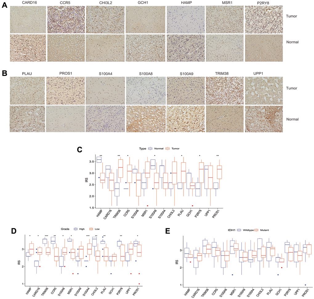 We used immunohistochemistry to evaluate the expression of the above-mentioned 14 genes (HAMP, CARD16, TRIM38, CCR5, S100A8, MSR1, S100A9, S100A4, CHI3L2, PLAU, GCH1, P2RY8, UPP1, PROS1) in glioma and normal tissues. The results showed that TRIM38, CCR5, PLAU, P2RY8, and PROS1 have a higher immunoreaction score (IRS) in tumors than normal tissues (p < 0.05, Figure 9A–9C), while the IRS of HAMP and S100A9 in gliomas were lower than normal tissues (p < 0.05, Figure 9A–9C). No significant differences were observed for the expression of the remaining proteins between tumor and normal tissues. Furthermore, we assess the differential expression of the 14 proteins between high and low-grade gliomas. We observed that the IRSs of PROS1, P2RY8, PLAU, CHI3L2, MSR1, CCR5, and TRIM38 were higher than its corresponding IRSs in low-grade glioma, while the IRSs of HAMP, CARD16, and S100A8 in high-grade glioma were lower than low-grade glioma (Figure 9D). However, no one of those 14 proteins were found to be associated with IDH1 mutation (Figure 9E).