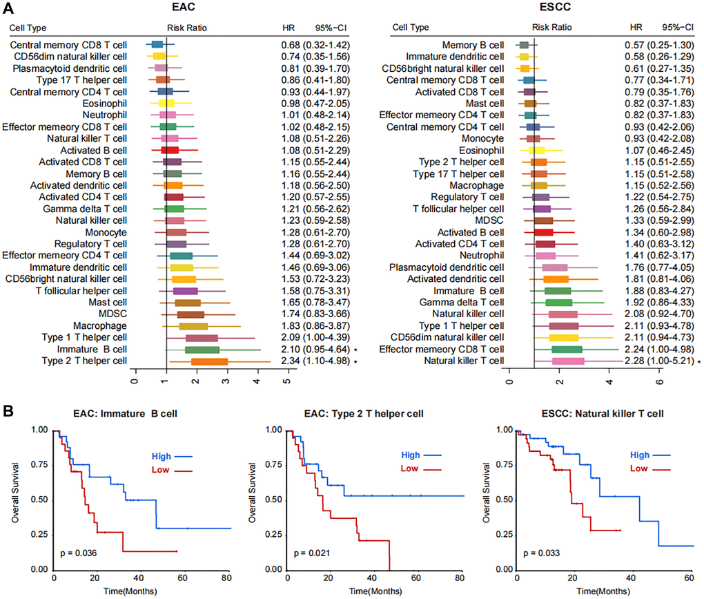 Generally, TME cells include inflammatory cells, such as T cells, B cells, dendritic cells, natural killer cells, neutrophils, macrophages, etc. The tumorigenesis of ESCA are etiologically related to the exposure of the refluxed gastric and bile acids, which trigger chronic inflammation and the occurrence of Barrett’s esophagus [23]. Other risk factors for ESCA, such as smoking and alcohol, also induce the toxic effects to increase the inflammation in the esophageal epithelium and subsequent play carcinogenic roles [24]. Thus, the ability of inflammatory responses may take part in the regulation of ESCA initiation and development. In addition, tumor cells can also recruit different immune cell populations or express immune checkpoints to suppress the anti-tumor immune response [21, 22]. Targeting immune checkpoints or supplement of the antitumor immune cells have been candidate options for anti-cancer therapy [8]. In this study, we found that natural killer T cell, immature B cell, natural killer cell and type 1 T helper cell were favorable for the prognosis of patients with ESCA.