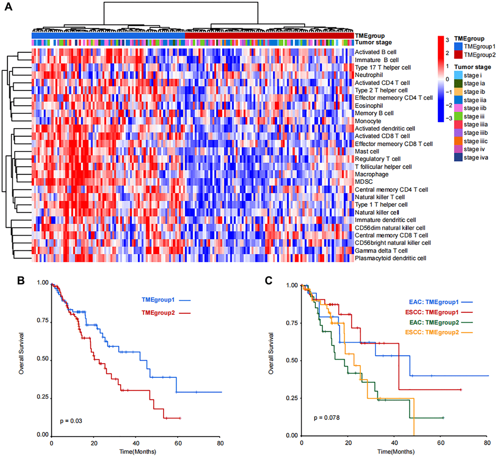 Due to little difference between TME cells in ESC and EACC, unsupervised clustering was applied in the 164 patients and two TME groups were identified (TMEgroup1 and TMEgroup2, Figure 2A). Subsequently, we tested four cluster number parameters in the analysis from k = 2 to k = 5 and the results of Consensus Cluster Plus revealed that 2 was the best cluster number (Supplementary Figure 4). By comparing the two TME groups, we found the higher enrichment score of 25 kinds of TME cells in TMEgroup1 (Figure 2A and Supplementary Figure 5). Additionally, the clinical outcome of TMEgroup1 was relatively favorable (P = 0.03, Figure 2B). The prognostic stratification based on TME cluster was not affected with esophageal cancer subtypes (P = 0.078, Figure 2C).