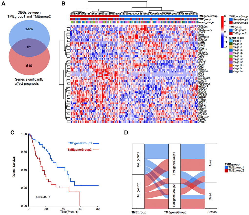In order to analyze the difference between TMEgroup1 and TMEgroup2, we identified the DEGs between the two TME groups. Then, the correlation between the DEGs and clinical prognosis were explored and a total of 62 genes were finally identified (Figure 3A). Based on the expressions of these 62 genes, the patients could be divided into two groups (TMEgeneGroup1 and TMEgeneGroup2) (Figure 3B). The gene patterns between two TME gene group could also be divided into two different parts, SS18L2, RPL14, ALG13, CRBN, CMC1, PIGT, TNNC2, TMEM74B, RBP2, PCK1, NOX1, MARVELD3, EMC10, LRRC45, RBBP7, TMEM106C, NDUFAF5, TASP1, CRNKL1, BCCIP,SNRPB, MRPS26, POLR2K, COX6C, CRIPT, TPRKB, ABRACL, CDKL1, HEBP2, MGST2, FNGR1, ARMT1, TXNL4B, DHODH, POLR2C, NVL, HIST1H1E, PUS10, CHTOP, EFNA1 belonged to the gene signature of TMEgeneGroup1 (TME metagene 1), and were highly expressed in TMEgeneGroup1, while WBP1L, CORO2B, SLIT2, ST6GALNAC6, ERAP2, FOS, CLN8, FAM189A2, RELL1, SEMA5A, XCR1, LSM10, NCDN, INTS5, GRB2, NUDT18, YAP1, MAP4K4, RNF144B, CDH24, PPIL2, BCR belonged to the gene signature of TMEgeneGroup2 (TME metagene 2), and were highly expressed in TMEgeneGroup2 (Figure 3B). The clinical outcomes were also found between the two groups and TMEgeneGroup2 had a poor prognosis (P = 0.00016, Figure 3C). Most patients in TMEgroup1 were clustered into TMEgeneGroup1, and the prognostic difference between TMEgeneGroup were more obvious in that between TMEgroups (Figure 3D). The TMEgeneGroups were significantly correlated with TMEgroup (p-value = 0.01, Pearson’s Chi-squared Test). The individual information for both TMEgroup, TMEgeneGroup and all clinical traits was presented in the Supplementary Table 1. The prognostic stratification revealed that in TMEgeneGroup2, the prognosis of patients with either EAC or ESCC was poor (Supplementary Figure 6).