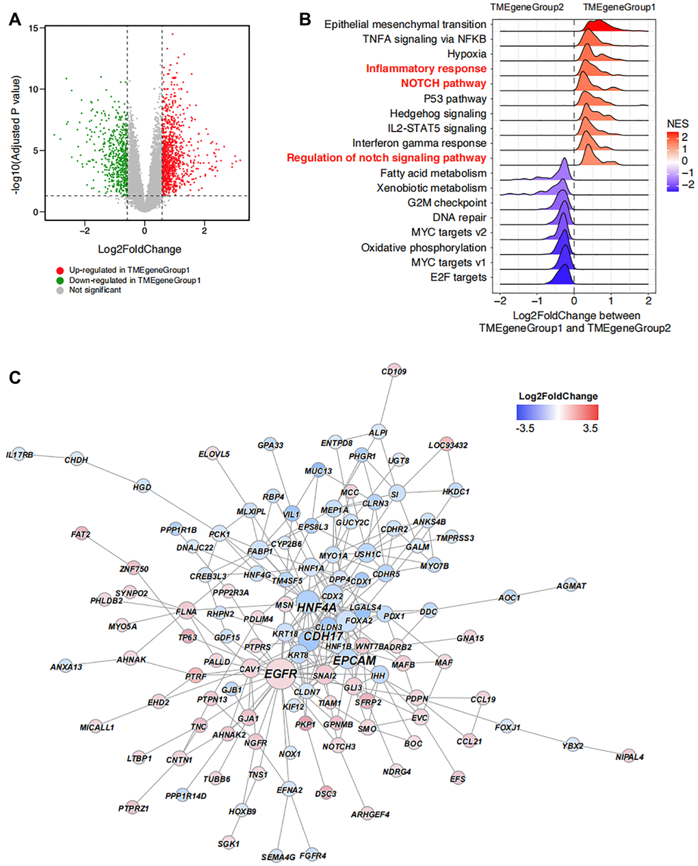 The DEGs between TMEgeneGroup1 and TMEgeneGroup2 was also calculated with down-regulated 546 genes in TMEgeneGroup and up-regulated 1028 genes in TMEgeneGroup2 (Figure 4A). The results form Gene Set Enrichment Analysis (GSEA) showed that epithelial mesenchymal transition, TNFA signaling via NFKB, inflammatory response, NOTCH signaling pathway were significantly up-regulated in TMEgeneGroup1, indicating that patients in TMEgeneGroup1 were active in immune response and the function of immune system were more efficient (Figure 4B). And to TMEgeneGroup2, G2M checkpoint, MYC targets v2 and oxidative phosphorylation were significantly up-regulated, indicating that cell cycle and tumor progression were activated in this group (Figure 4B). Moreover, EGFR was significantly up-regulated in TMEgeneGroup1 by the hub gene analysis, and it might be a therapeutic target in ESCA (Figure 4C). Other three hub genes, HNF4A, CDH17 and EPCAM were up-regulated in TMEgeneGroup2, and might serve as the biomarkers of TMEgeneGroup2 (Figure 4C).