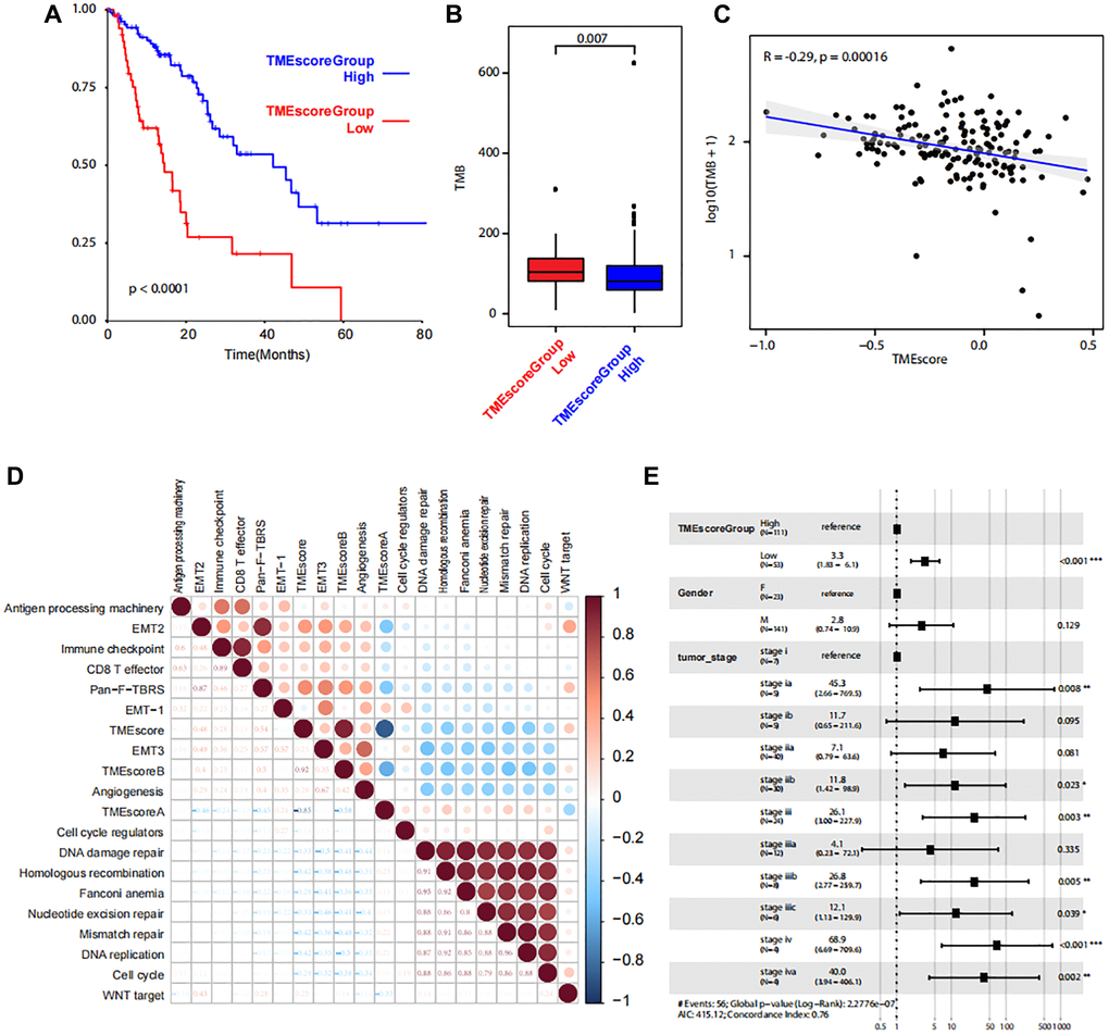 Based on the TMEscoreA and TMEscoreB, we calculated the final TMEscore and we identified that the clinical outcome of patients with higher TMEscore was favorable (P < 0.0001, Figure 5A). Also, the tumor mutation burden (TMB) in low TME score group was higher than that in high TME score group (Figure 5B). The correlation analysis revealed a significant correlation between TMEscore and TMB (Figure 5C). After filtration of gene mutation profile between low TMEscore and high TMEscore, we found that the mutation frequency of SYNE1 was higher in low TME score (Supplementary Figure 8). Gene expression level of 17 pathways were also analyzed to identify the correlation between pathways and TMEscore, and the results revealed the positive correlation with EMT2, immune checkpoint, and Pan-F-TBRS, and negative correlation with DNA damage repair, homologous recombination, Fanconi anemia, nucleotide excision repair, mismatch repair, DNA replication and cell cycle (Figure 5D). Multifactor analysis showed TMEscore was an independent prognostic factor for the prognosis of patients with ESCA (Figure 5E).