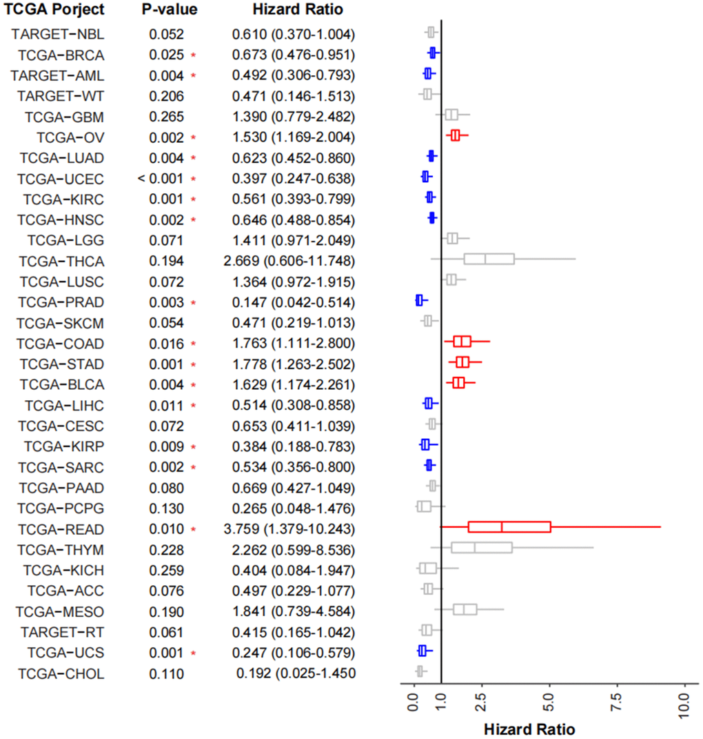 To validate the prognostic impact of TMEscore model in cancer cohorts, we use 32 TCGA cancer cohorts (TCGA-ESCA was not included) and calculated TMEscoreA and TMEscoreB of each patient. Generally, 11 (34.3%) cohorts (TCGA-PRAD, TCGA-UCS, TCGA-KIRP, TCGA-UCEC, TARGET-AML, TCGA-LIHC, TCGA-SARC, TCGA-KIRC, TCGA-LUAD, TCGA-HNSC, TCGA-BRCA) revealed the TMEscore as a good prognostic indicator, whereas 5 (15.6%) cohorts (TCGA-OV, TCGA-BLCA, TCGA-COAD, TCGA-STAD, TCGA-READ) revealed as a poor prognostic indicator (Figure 6). By validating in other TCGA cancer cohorts, we found most cohorts (21/32 of TCGA cohorts had HR less than 1 and 11/32 were significant) had a similar prognostic trend using TMEscore, revealing TMEscore as a helpful indicator for tumorigenic microenvironment and prognosis.