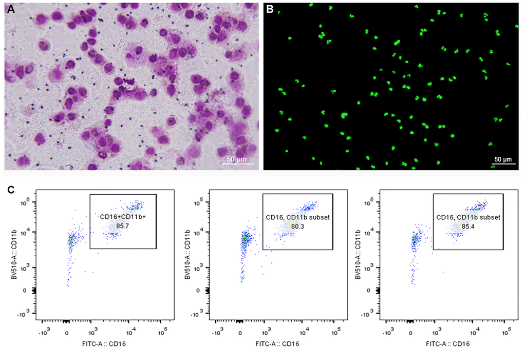 To observe the morphology of neutrophils, Giemsa-Wright and cytox fluorescent nuclear staining were used. The structure of neutrophils could be clearly seen under the microscope, and the nucleus was divided into 2–5 lobes (Figure 1A, 1B). Moreover, the results of flow cytometry showed that purity of neutrophils was more than 80% (Figure 1C).