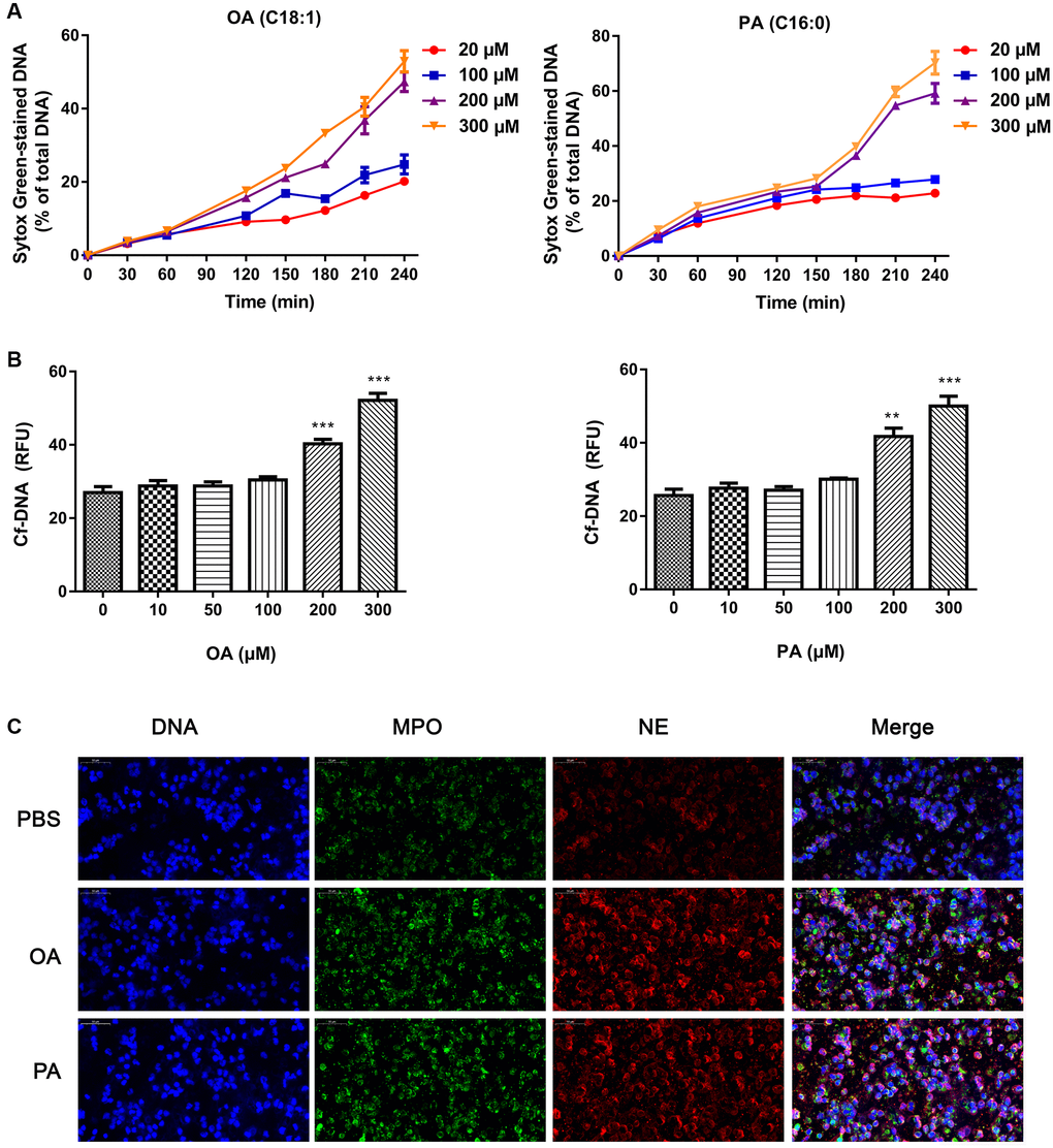 Freshly isolated neutrophils were seeded in 96-well black plates in the presence of a non-cell-permeant DNA binding dye Sytox Green (5 μM, Invitrogen, Saint Aubin, France). After stimulated with increasing concentrations of OA and PA at 37°C with 5% CO2 in the dark, DNA release was followed by measuring Sytox green fluorescence at 0, 30, 60, 90, 120, 150, 180, 210, and 240 min in a microplate fluorescence reader (Tristar™ LB941 BERTHOLD, Bad Wildbad, Germany).