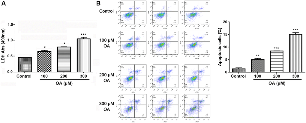 Extracellular LDH release usually indicated damaged cells. As shown in Figure 4, compared with the control group, OA treatment significantly increased LDH release in a dose-dependent manner (all P < 0.05), suggesting that the cell activity decreased obviously. Moreover, cell apoptosis was detected after exposing cells to different concentration of OA. The results showed that OA treatment significantly prompted cell apoptosis in a dose-dependent manner (all P < 0.05). Collectively, it could be conducted that OA treatment increased cell damage.