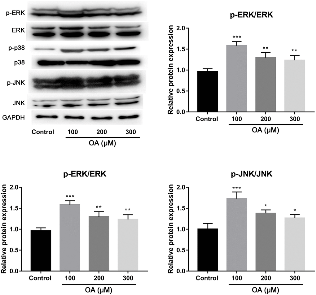 Western blot was used to detect the effect of OA on p38, ERK, and JNK signaling pathways. Lysate buffer was added in the ratio of 200 μL 2 × SDS loading buffer to 1 × 107 cells, and vortex oscillates until the cell mass was not visible. The homogenate was collected after centrifugation, and the protein concentration of supernatant was measured by Bradford method. Equal amounts of proteins (40 μg) was loaded on 10% SDS-PAGE and then transferred to nitrocellulose membranes (Millipore, Billerica, MA, USA). After blocked with 5% nonfat milk, the membranes were incubated with primary antibodies against JNK, p-JNK, ERK, p-ERK, p38, p-p38, and GAPDH (1:1000 dilution; Solarbio) overnight at 4°C. Then the membranes were incubated for 1 h with horseradish peroxidase-conjugated secondary antibodies (1:3000 dilution; Solarbio). Protein bands were visualized using an ECL detection kit (Pierce, Thermo Scientific, Waltham, USA). Proteins were quantified by densitometry with the Image J 1.8.0 software (National Institutes of Health, USA).