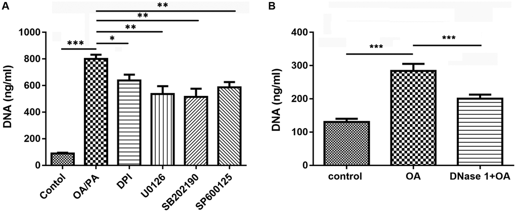 To further confirm that OA-induced the formation of NETs depended on NADPH oxidase, p38, ERK, and JNK pathways, neutrophils were treated with their corresponding inhibitors. The results showed that pretreatment with NADPH oxidase inhibitor (DPI), ERK1/2 inhibitor (U0126), p38 inhibitor (SB202190) and JNK inhibitor (SP600125) could significantly inhibited the increase of NETs induced by OA (all P < 0.05, Figure 6A), suggesting that NADPH oxidase as well as p38, ERK, and JNK pathways might be involved in the formation of NETs. Moreover, we found that DNase I (a NET inhibitor) treatment also significantly decreased OA-induced formation of NETs (P < 0.001, Figure 6B).