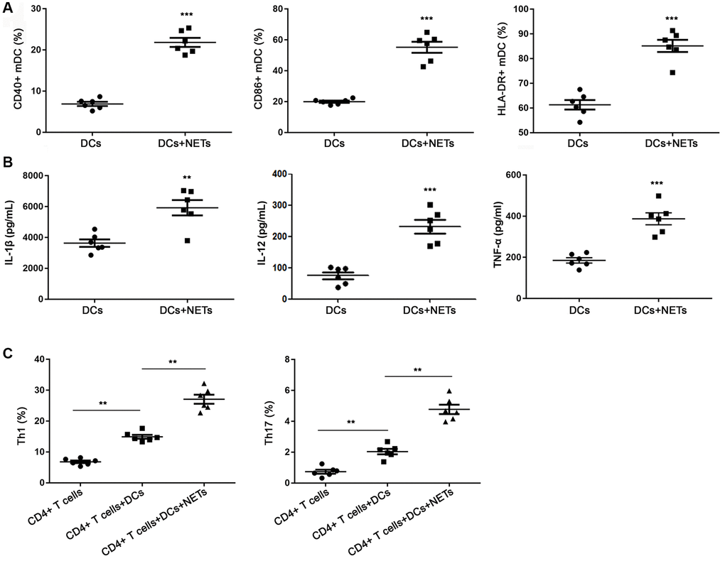 It is reported that DCs regulated the differentiation of lymphocytes in a pathogen-specific manner [23–25]. In order to explore the role of DCs in the immune response of Th1 and Th17 cells to NETs, we detected the DCs with or without stimulation by NETs by flow cytometry. As revealed in Figure 7C, there were a few differentiated Th1 and Th17 cells in the only primary CD4+ T well without DCs. The proportion of Th1 and Th17 cells in the co-culture system of DCs stimulated by NETs and primary CD4+ T was significantly higher than of DCs without stimulated by NETs and primary CD4+ T (P < 0.05). These data suggested that NETs-stimulated DCs promoted the differentiation of primary CD4+ T cells into Th1 and Th17 cells.