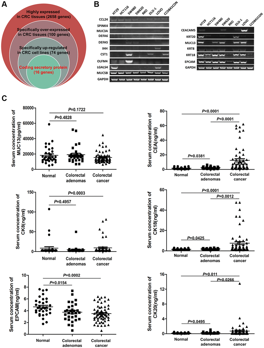 With the vast amounts of CRC transcriptomics and DNA methylomics data that are continuously generated and easily accessed from published sources, it is possible to use bioinformatics to screen biomarkers for CRC diagnosis, specifically and systematically. In this study, The Cancer Genome Atlas (TCGA), Genotype-Tissue Expression (GTEx) [12], Cancer Cell Line Encyclopedia (CCLE) [13], Gene Expression Profiling Interactive (GEPIA) [14], Human Protein Atlas (HPA) [15], UCSC [16], UALCN [17] and MEXPRESS [18] were used to screen specific secretory protein-encoding genes, de-methylated overexpressed genes and hyper-methylated underexpressed genes in CRC tissues and cell lines. Then, these candidate biomarkers in CRC cell lines and clinical serum samples including CRC, colorectal adenoma (CA) patients and healthy controls, were detected and the relationship with clinicopathologic parameters and their value as CRC diagnostic markers were analyzed.