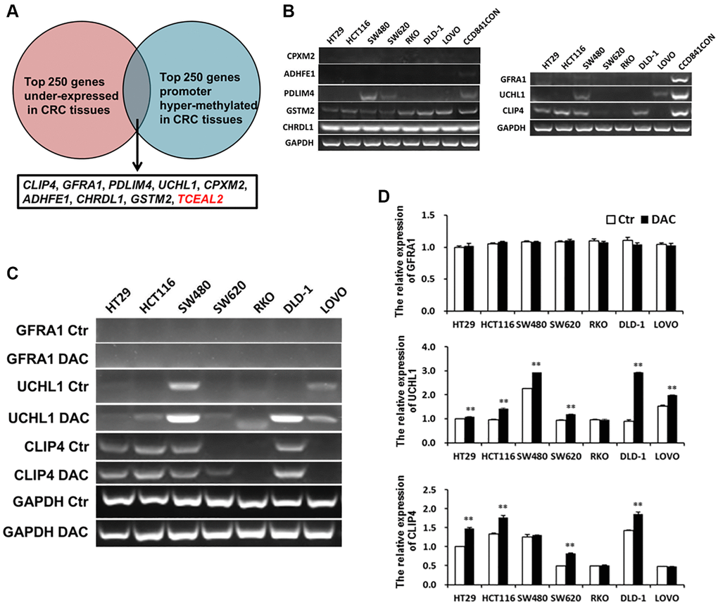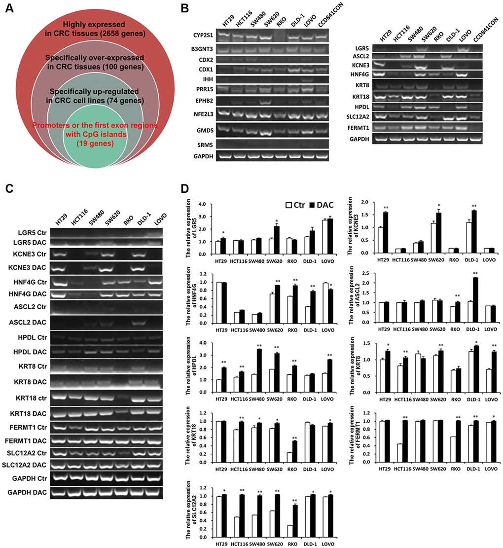 Seven human CRC cell lines (HT29, HCT116, SW480, SW620, RKO, DLD-1 and LOVO) and one normal colon cell line (CCD841CON) were obtained from the cell bank of the Chinese Academy of Sciences (Shanghai, China). All of cell lines were cultured in DMEM medium containing 10% fetal bovine serum (BI) and 100 IU/ml penicillin and streptomycin (Gibco) and maintained in 37°C in a humidified incubator with 5% CO2. For de-methylation treatment, cultured cells were incubated with 10 μm 5-aza-2’-deoxycytidine (Sigma, USA) for 3 days with medium changed every day.