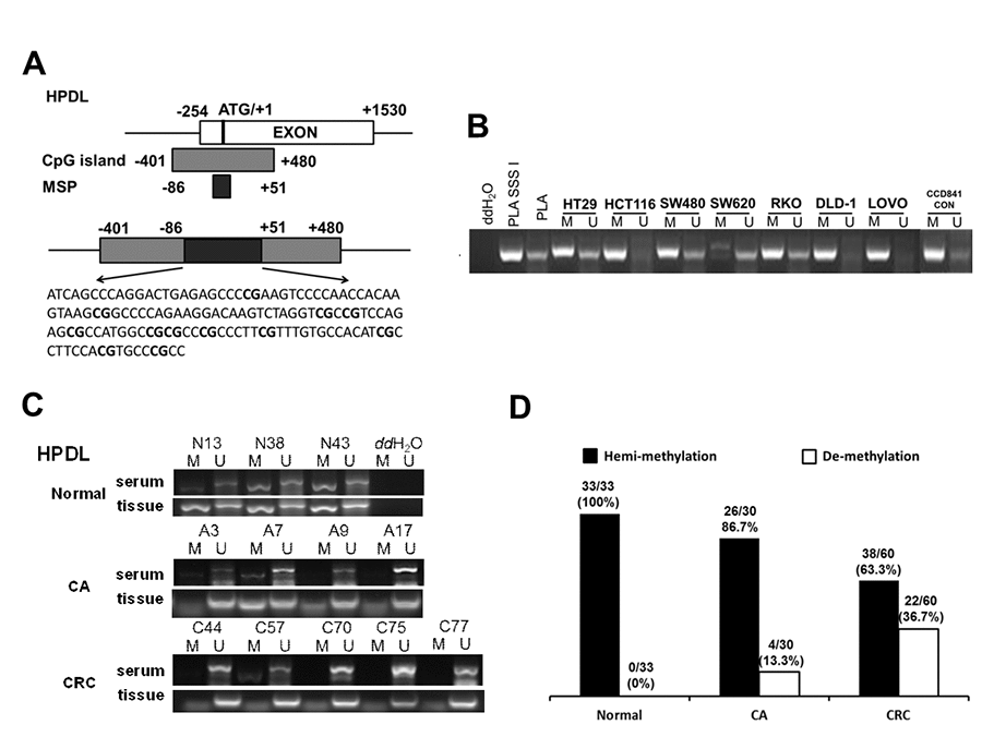 Because serum contains a certain amount of DNA derived from lysed tumor cells, the methylation status of HPDL was detected in the serum of 60 CRC patients, 30 CA patients and 33 healthy controls. As shown in Figure 4C, HPDL de-methylation was detectable in CRC and CA patients but not in healthy controls. Statistical analysis showed that the de-methylated frequency of serum HPDL was 36.7% (22/60) in CRC patients and 13.3% (4/30) in CA patients (Figure 4D). Additionally, representative cases consisting of 20 CRC, 10 CA patients and 10 healthy controls were selected to detect HPDL methylation status in serum and colorectal normal or tumor tissue from the same patient. The results indicated that the HPDL methylation status in serum was almost consistent with that in CRC tissues (Figure 4C).