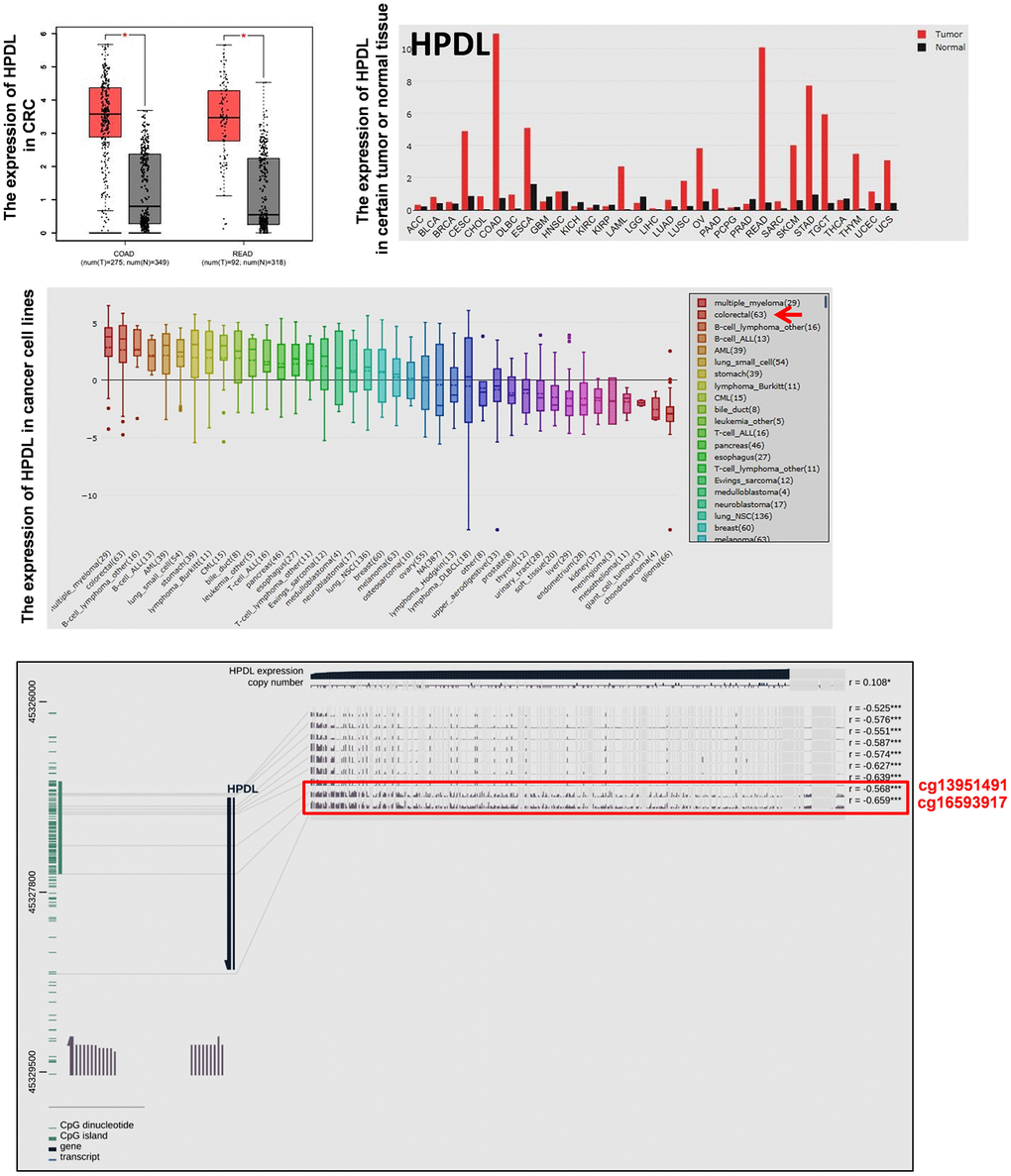 Normally, DNA de-methylation can lead to genome instability and high expression of oncogenes. Based on the previous bioinformatics analysis results, among 74 specifically overexpressed genes, UCSC showed that 19 genes possessed CpG islands in their promoters or the first exon region (Supplementary Table 4; Figure 3A). Detecting the expression of 19 genes in 7 CRC cell lines and CCD841CON revealed that HPDL, LGR5, ASCL2, KCNE3, HNF4G, KRT8, KRT18, SLC12A2 and FERMT1 were significantly overexpressed in CRC cell lines (Figure 3B). To test the relationship between DNA methylation status and the expression of these genes in CRC, the expression of 9 genes in 7 CRC cell lines treated with 5′-aza-2′-deoxycytiding (DAC) were detected. As shown in Figure 3C and 3D, HPDL, KRT8, KRT18, FERMT1 and SLC12A2 were increased in CRC cell lines in response to DAC treatment. According to the CpG island region, MSP primers for these genes were designed and the methylation status of 5 genes in CRC cell lines and a normal colon cell line were tested. The results revealed that only HPDL presented more de-methylation status in CRC cell lines (especially SW620) than CCD841CON (Figure 4A and 4B). GEPIA and CCLE demonstrated that HPDL was highly expressed in CRC tissues and CRC cell lines; MEXPRESS also revealed that CRC tissues possessed HPDL de-methylated regions (Probes ID: cg13951491 and cg16593917) compared with normal tissue (Figure 5). These results indicated that HPDL overexpressed in CRC may be upregulated by DNA de-methylation.